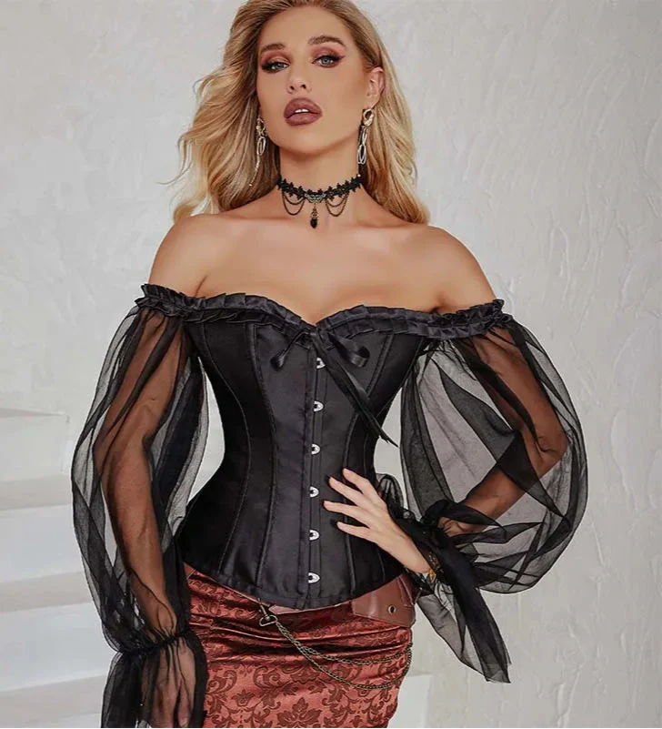 • 1 x Ruffled Gothic Corselet Top With Puff Sleeves And Lace-Up Boning Transparent Satin Overbust Corset For Women