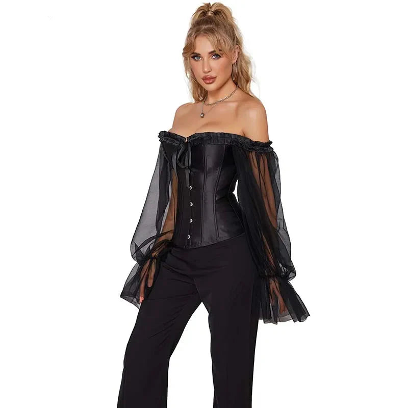 • 1 x Ruffled Gothic Corselet Top With Puff Sleeves And Lace-Up Boning Transparent Satin Overbust Corset For Women
