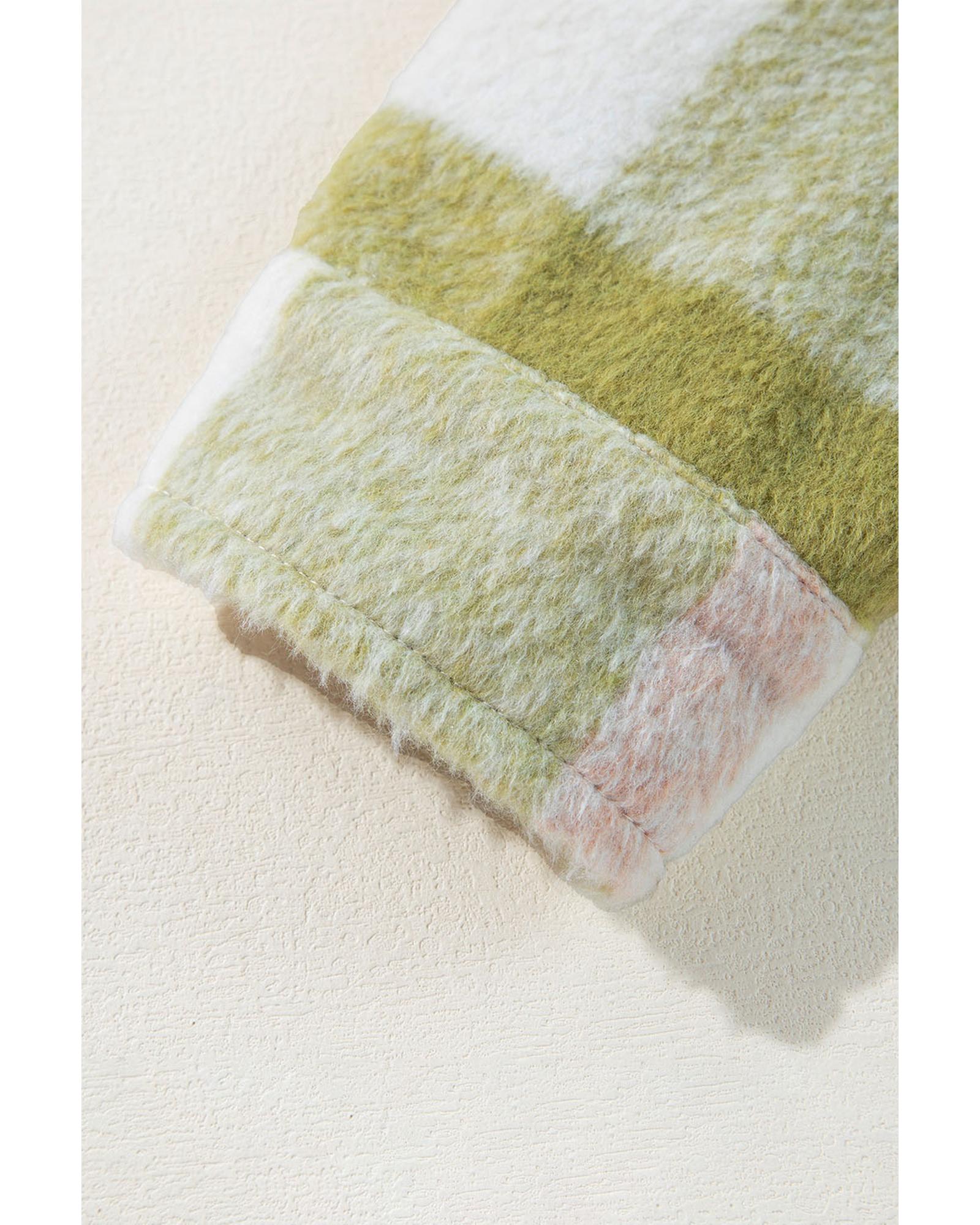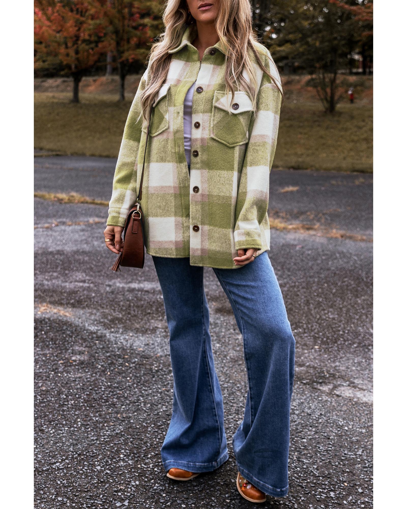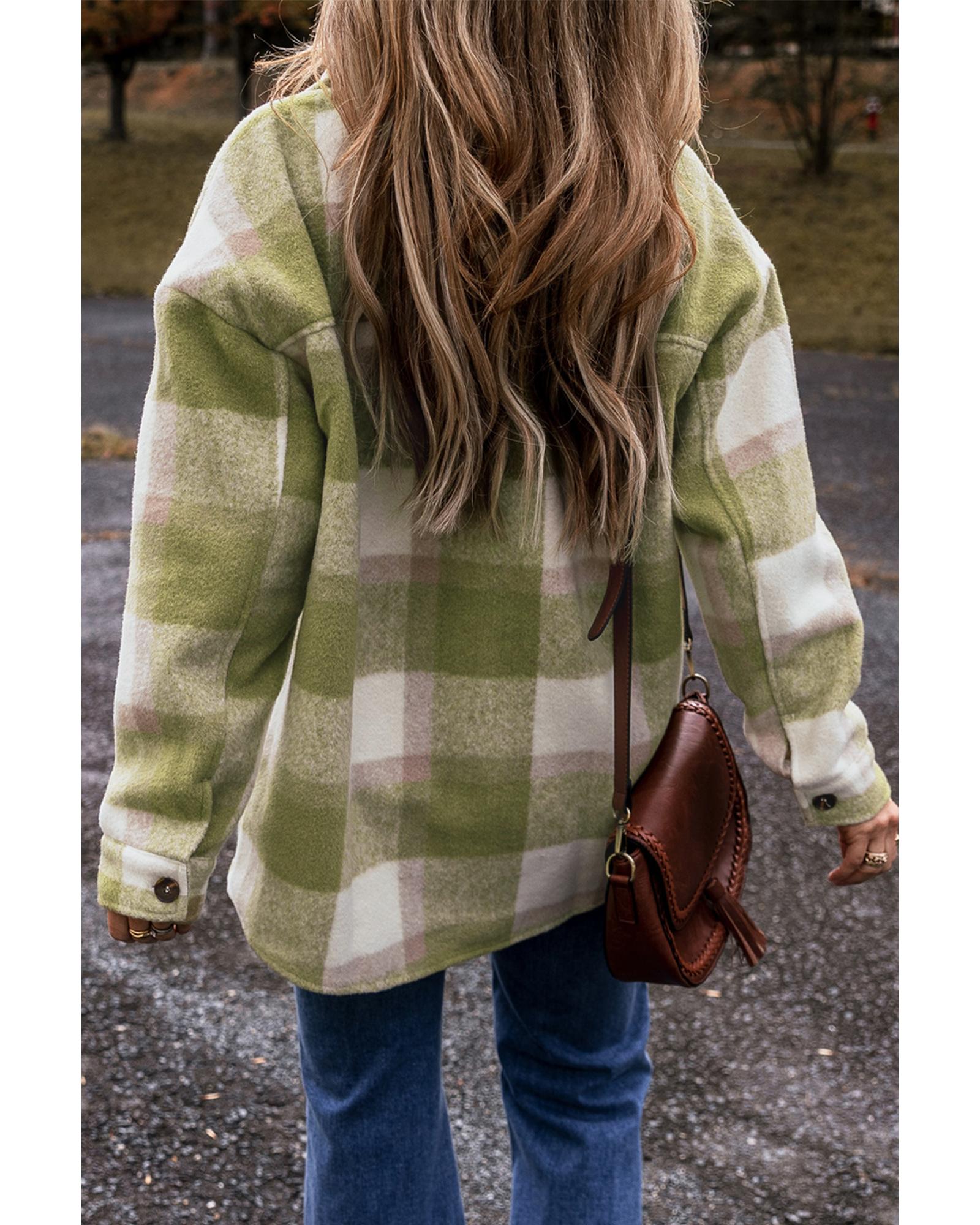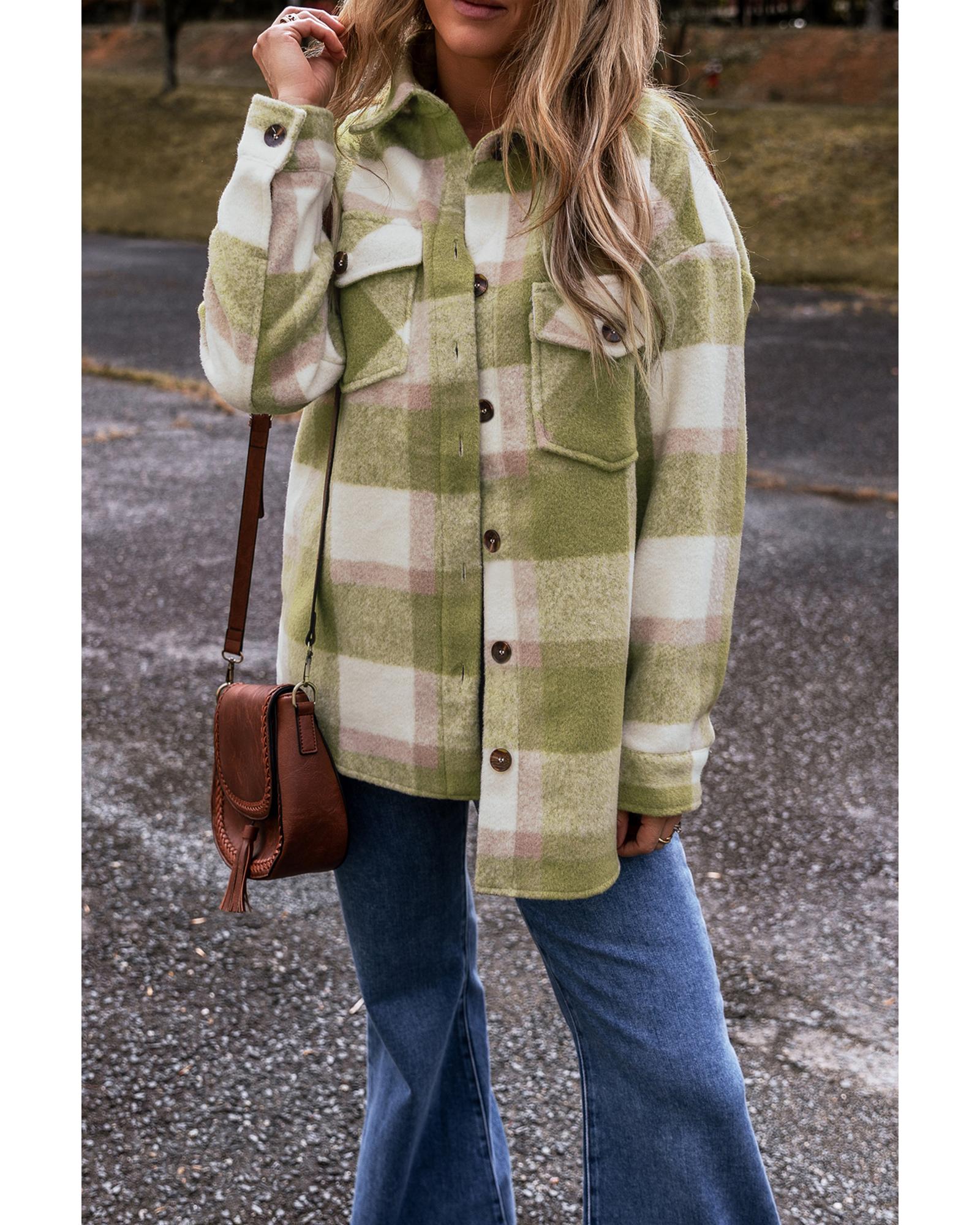 Sage Green Plaid Print Buttoned Flap Pockets Baggy Shacket – S