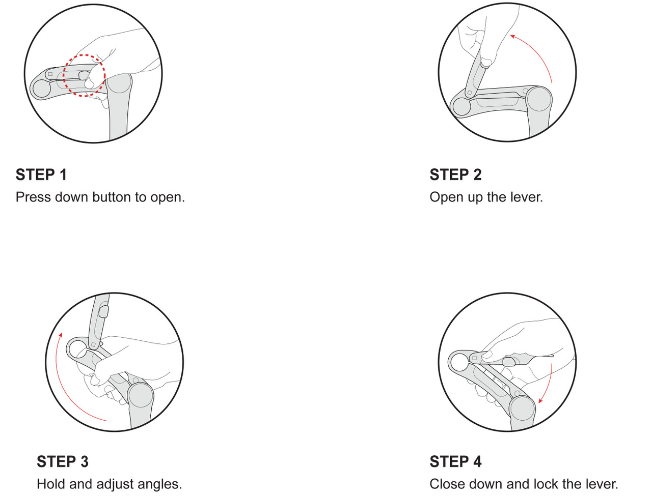 - Simple but powerful QR mechanism with pre-adjust screw for handlebar tolerance control.