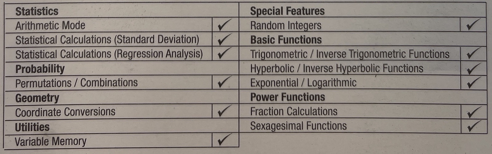 - Permutations, Combinations, Exponential, and Logarithmic calculations.