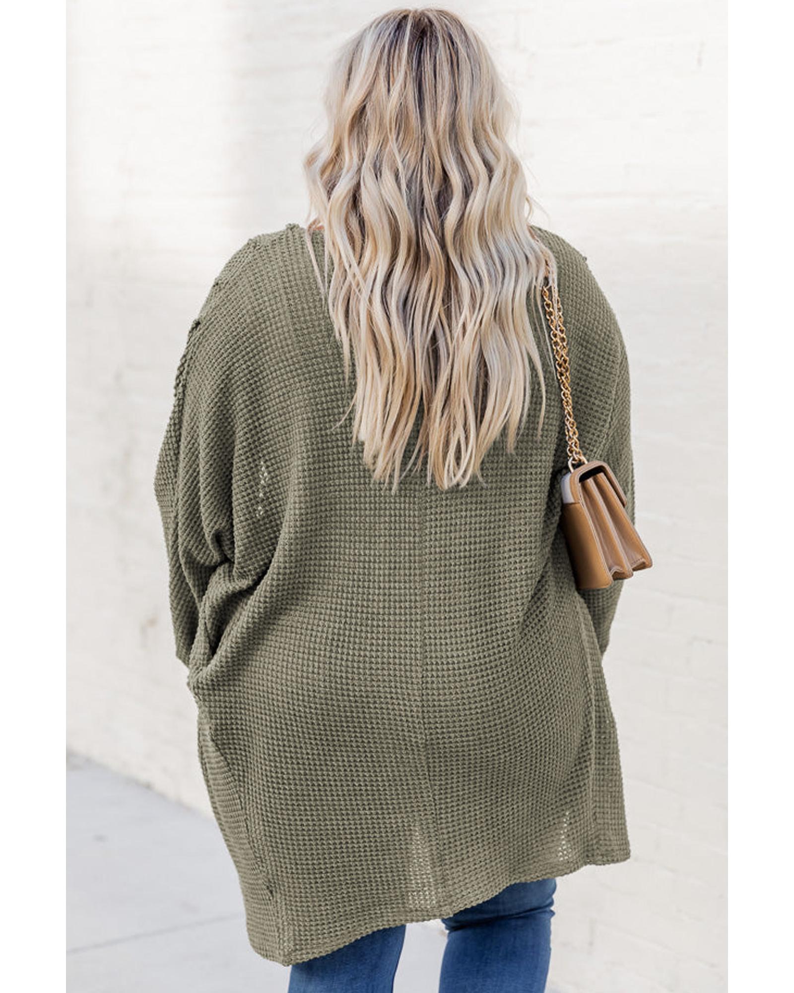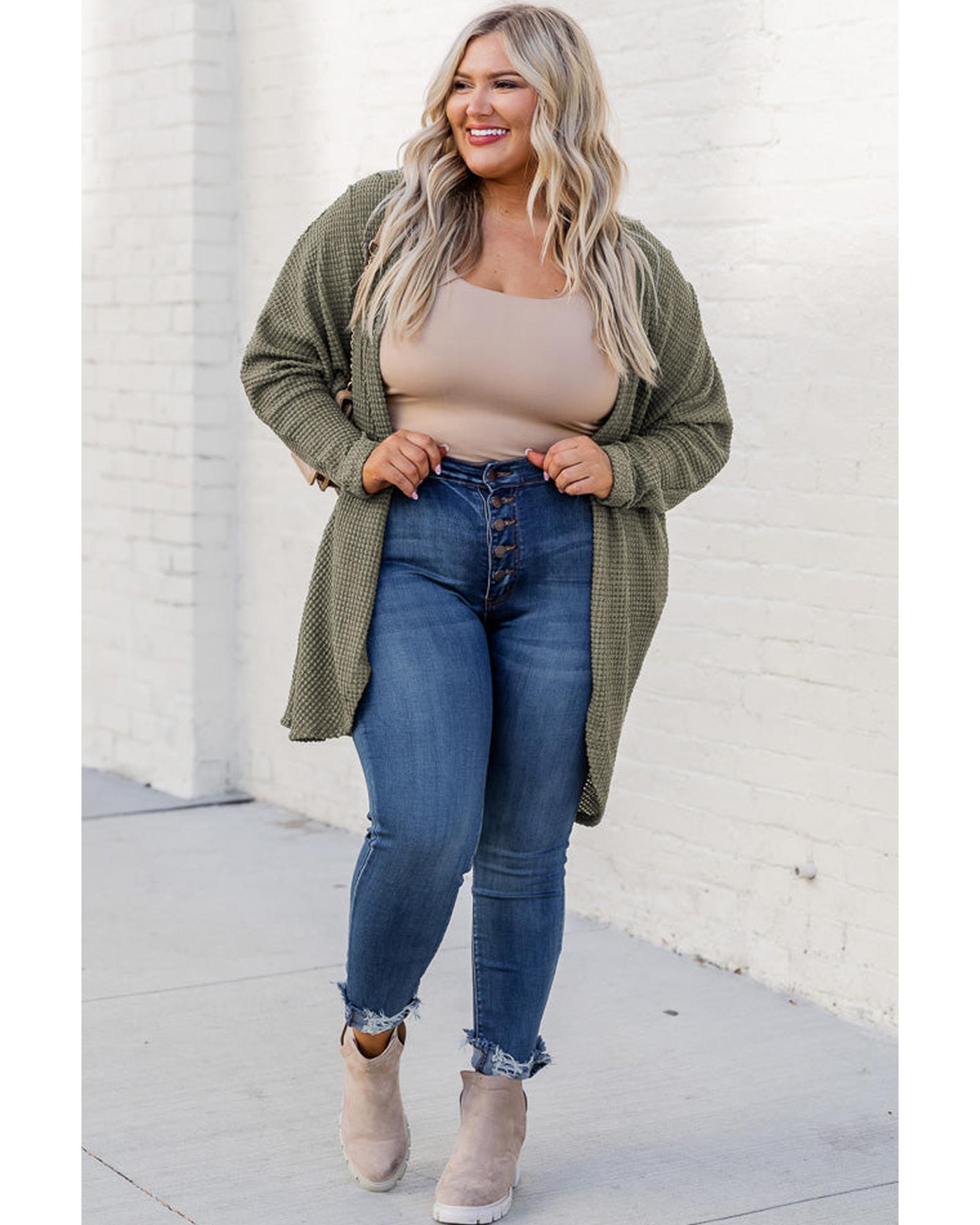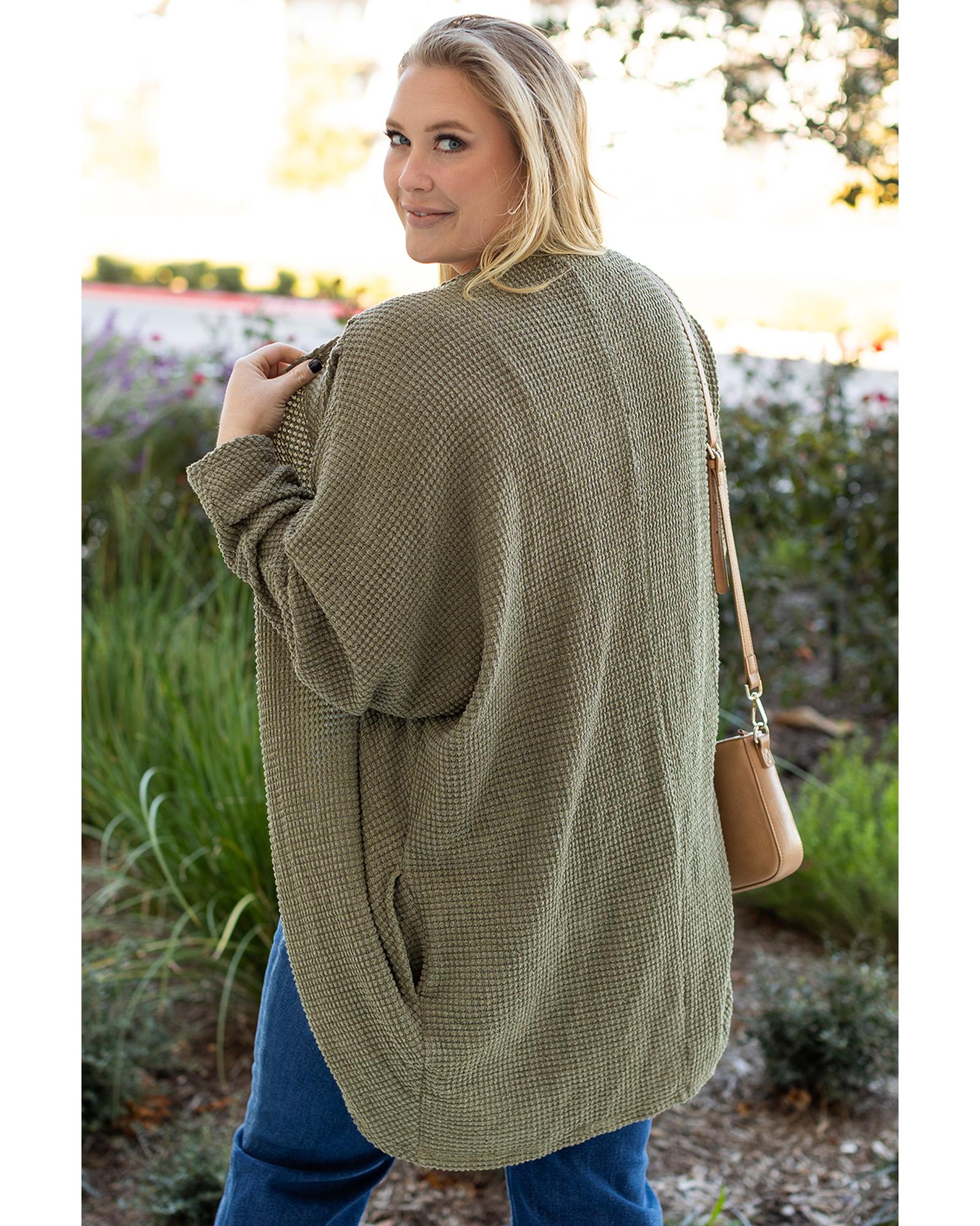 Seagrass Waffle Knit Drop Shoulder Open Front Pocketed Plus Size Cardigan – 1X