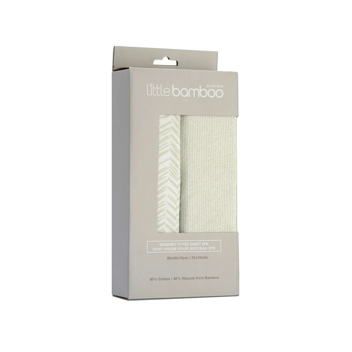 This Set of 2 Little Bamboo Jersey Fitted Sheet Bassinet Size Herringbone Whisper is deliciously soft and smooth, perfect for your baby’s sensitive skin. Adorned in a charming herringbone pattern with a serene white and pale green hues, this sheet combines elegance with functionality. Made from a blend of bamboo and cotton, this sheet offers softness and breathability that will drift your little one into peaceful sleep.