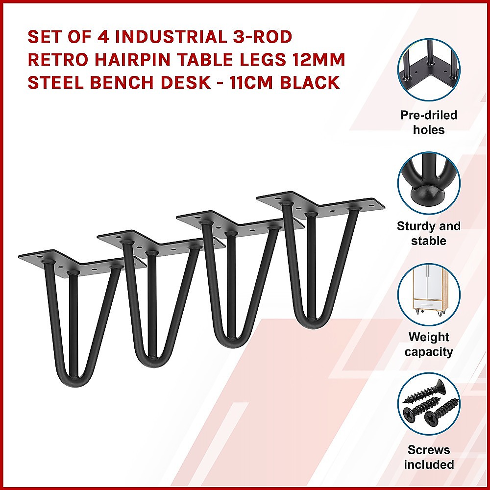 Set of 4 Industrial 3-Rod Retro Hairpin Table Legs 12mm Steel Bench Desk – 11cm Black