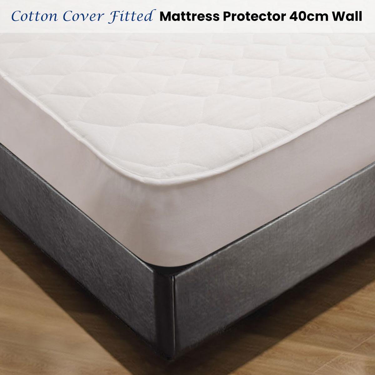 Allergy Free Mattress Protector. Quilted Cotton Cover, 100GSM polyester fibre filled. Fitted 40cm wall. Super Absorbent Cotton Cover. Hygienic. Cool in Summer & Warm in Winter. Luxurious Multi Needle Micro Quilted.