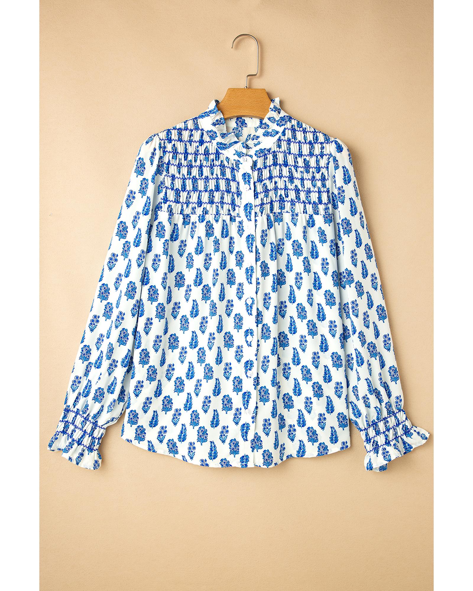 Sky Blue Boho Floral Printed Lantern Sleeve Frilled Neck Shirred Shirt – L