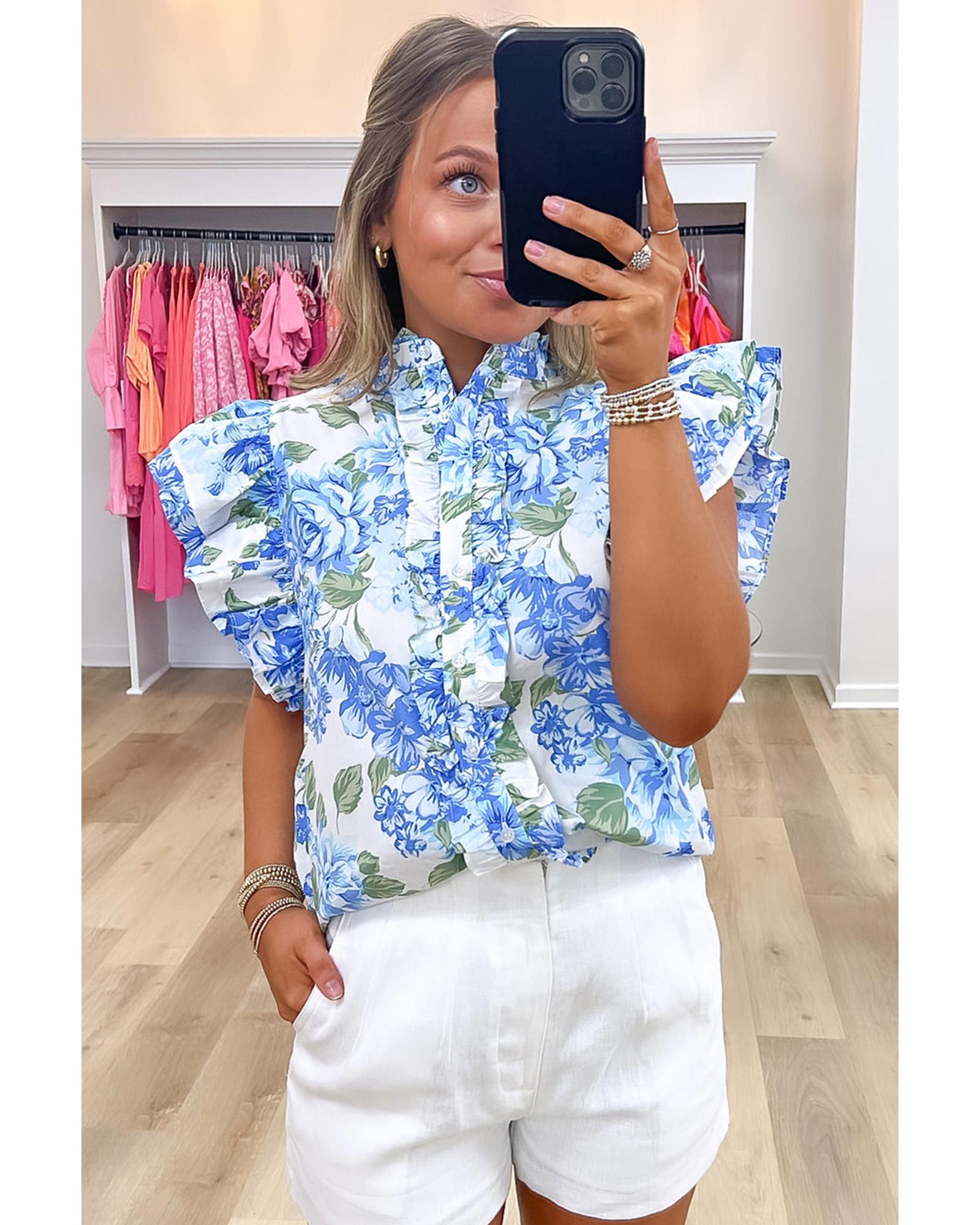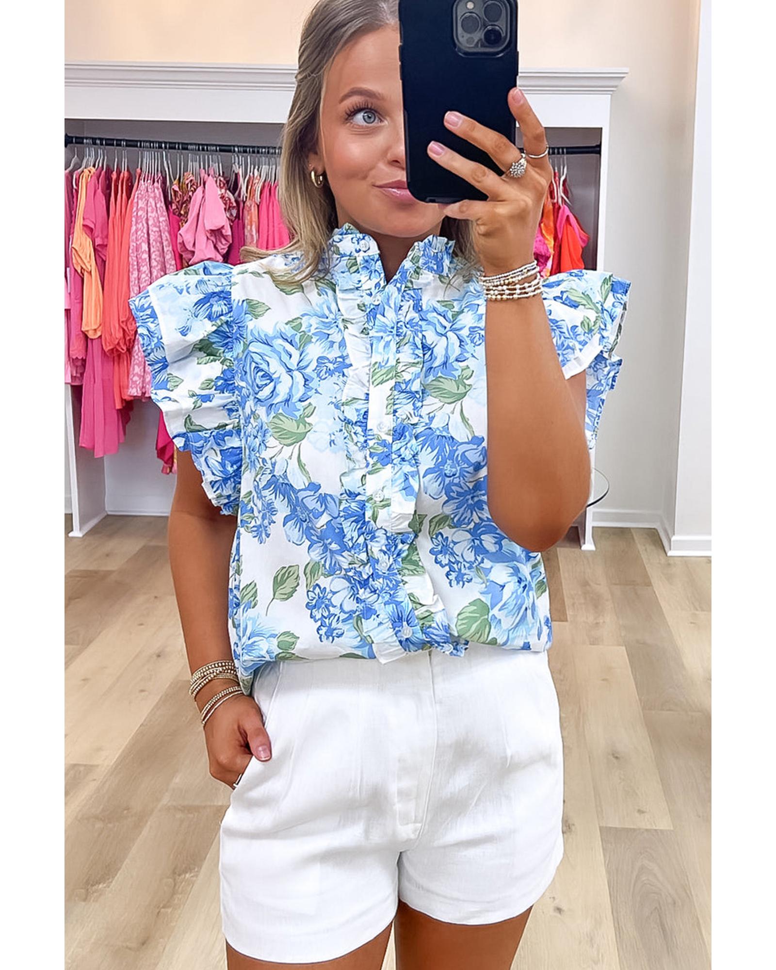 Sky Blue Floral Print Ruffle Sleeve Frilly Button Up Shirt – L