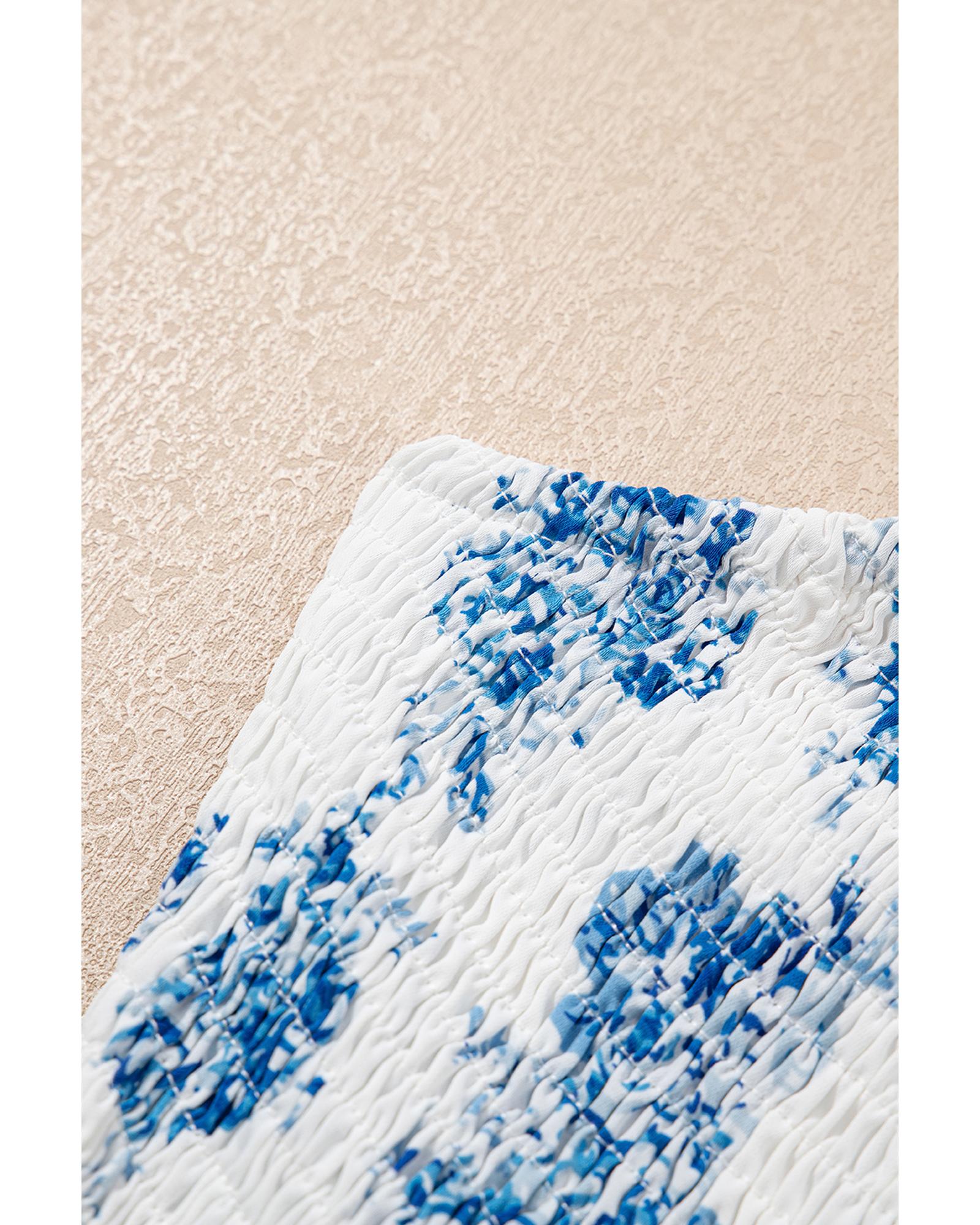 Sky Blue Floral Print Shirred Knot Shoulder Sleeveless Long Dress – M