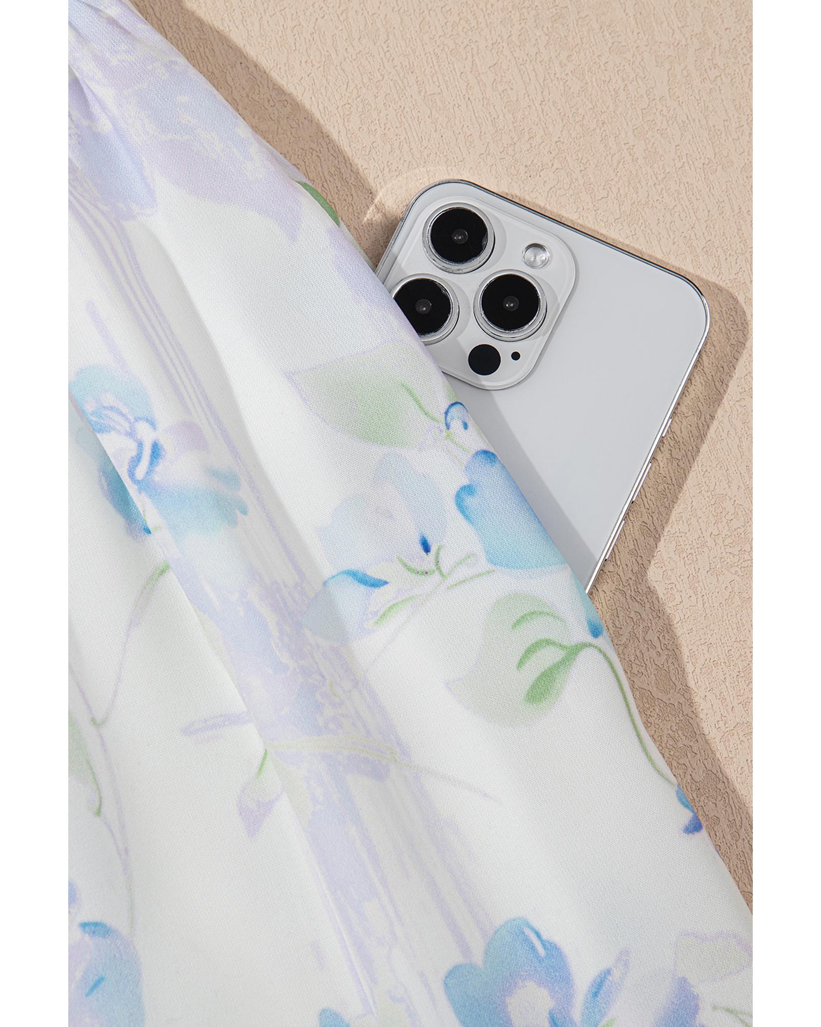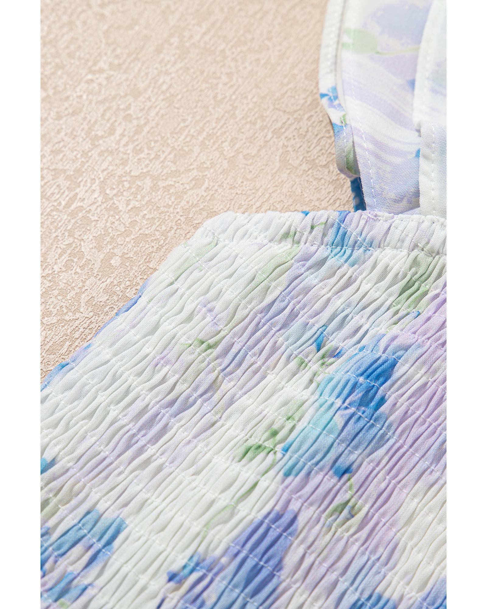 Sky Blue Floral Smocked High Waist Double Ruffle Sleeveless Long Dress – M