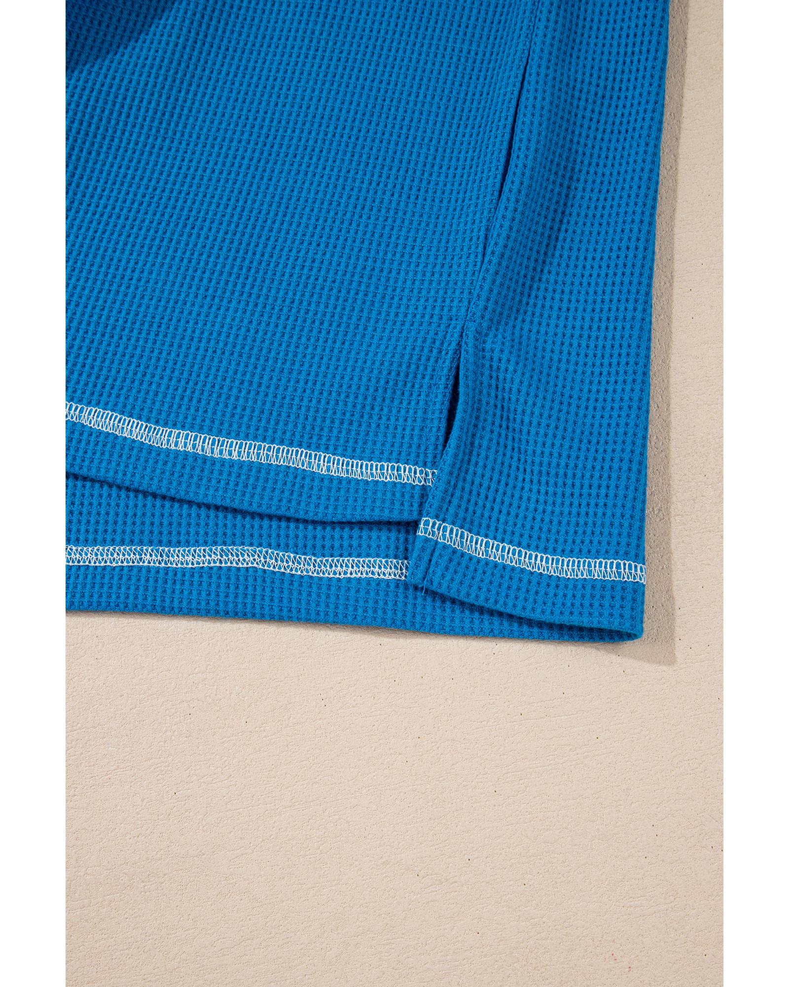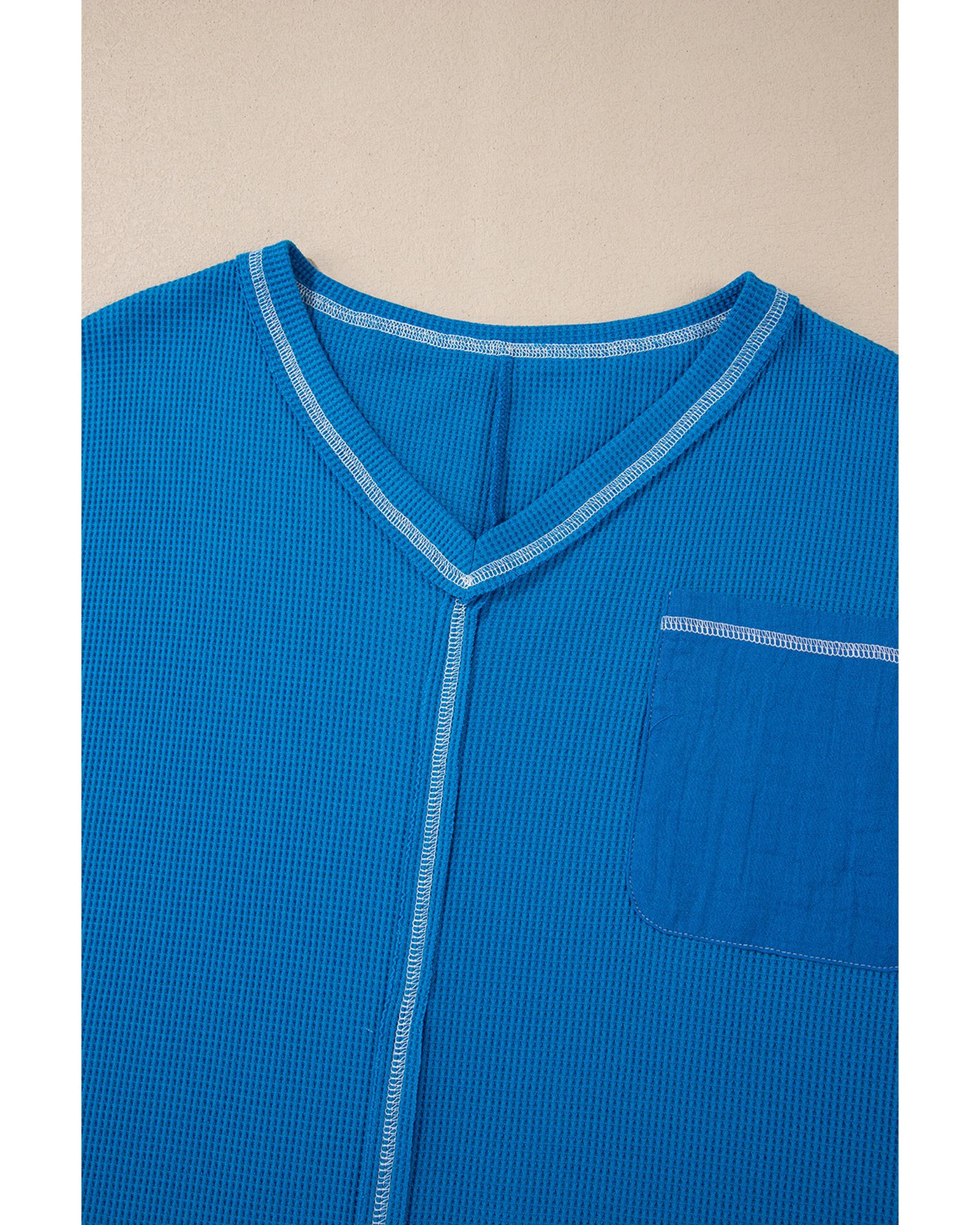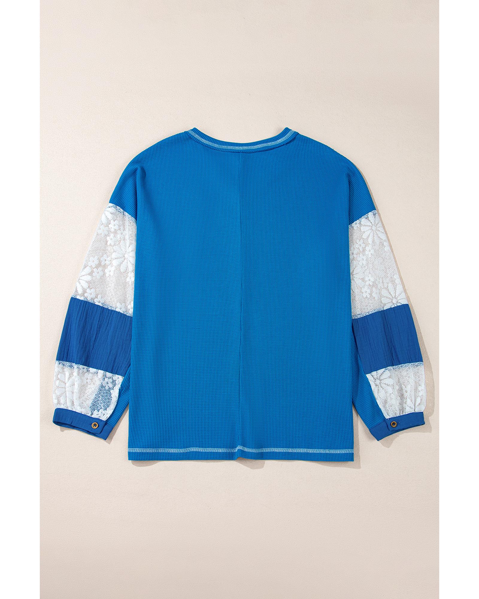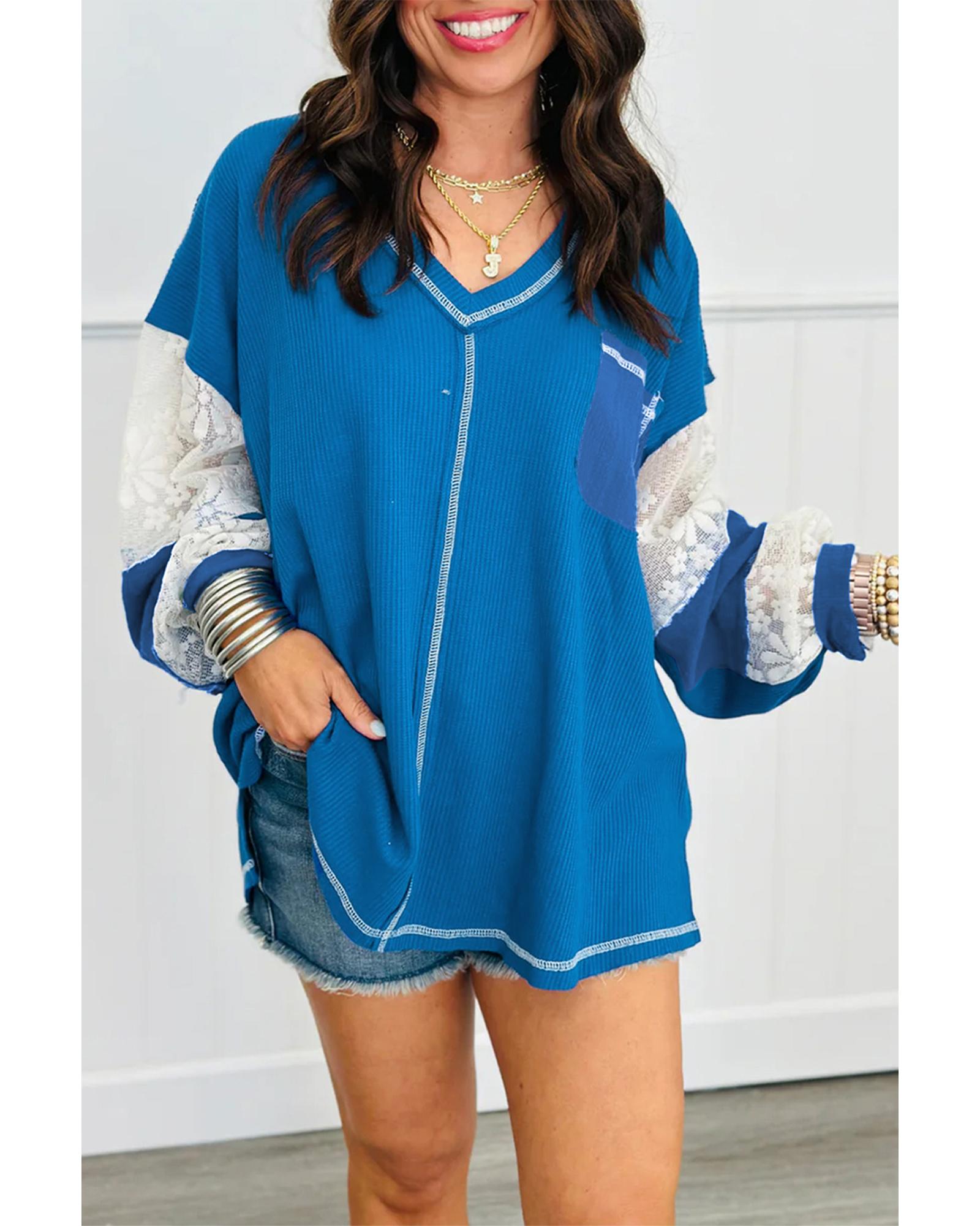 Sky Blue Lace Floral Patchwork Sleeve Stitching V Neck Rib Knit Blouse – L
