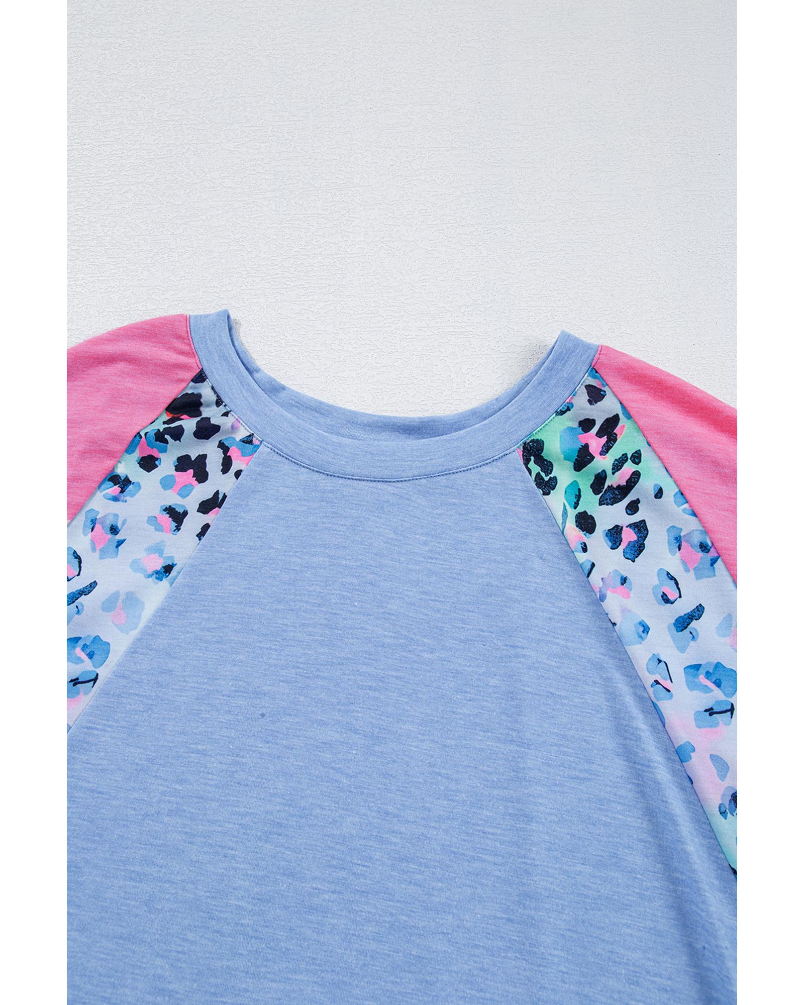 Sky Blue Leopard Print Patch Colorblock Plus Size T Shirt – 2X