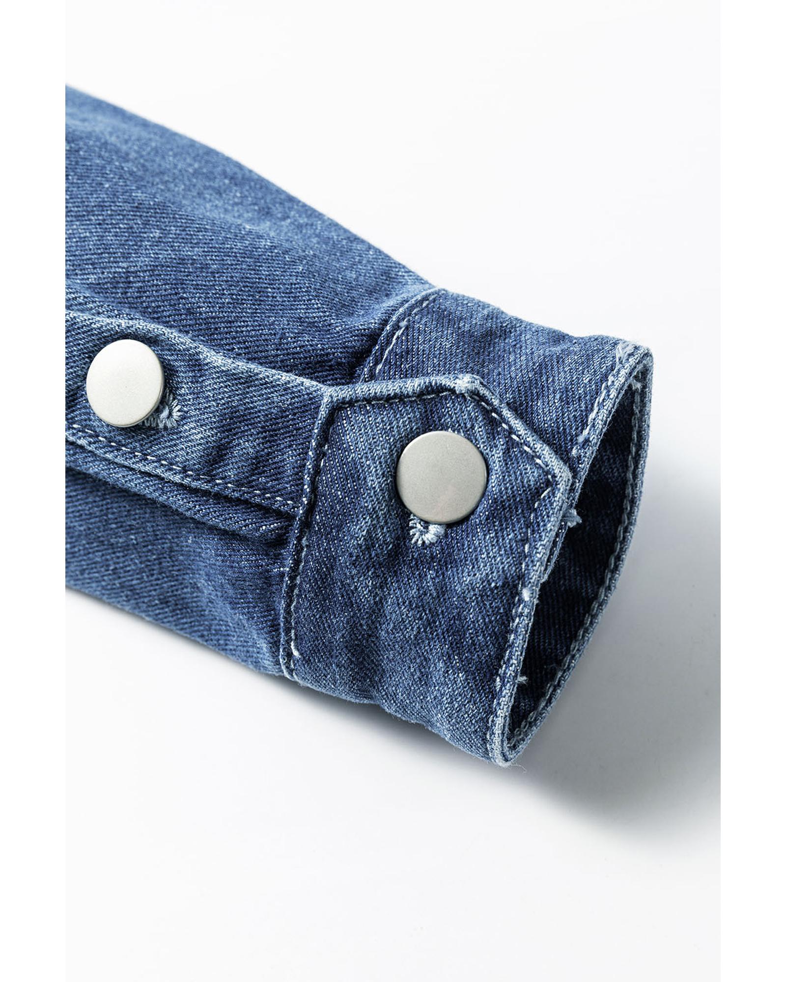 Sky Blue Light Wash Distressed Frayed Long Denim Jacket – S