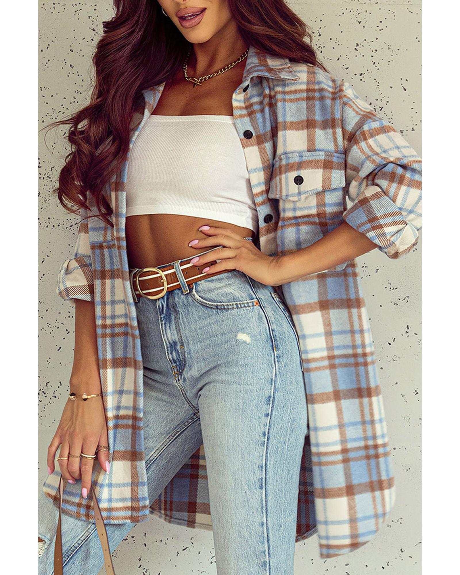 Sky Blue Plaid Flap Pocket Long Sleeve Shacket – S