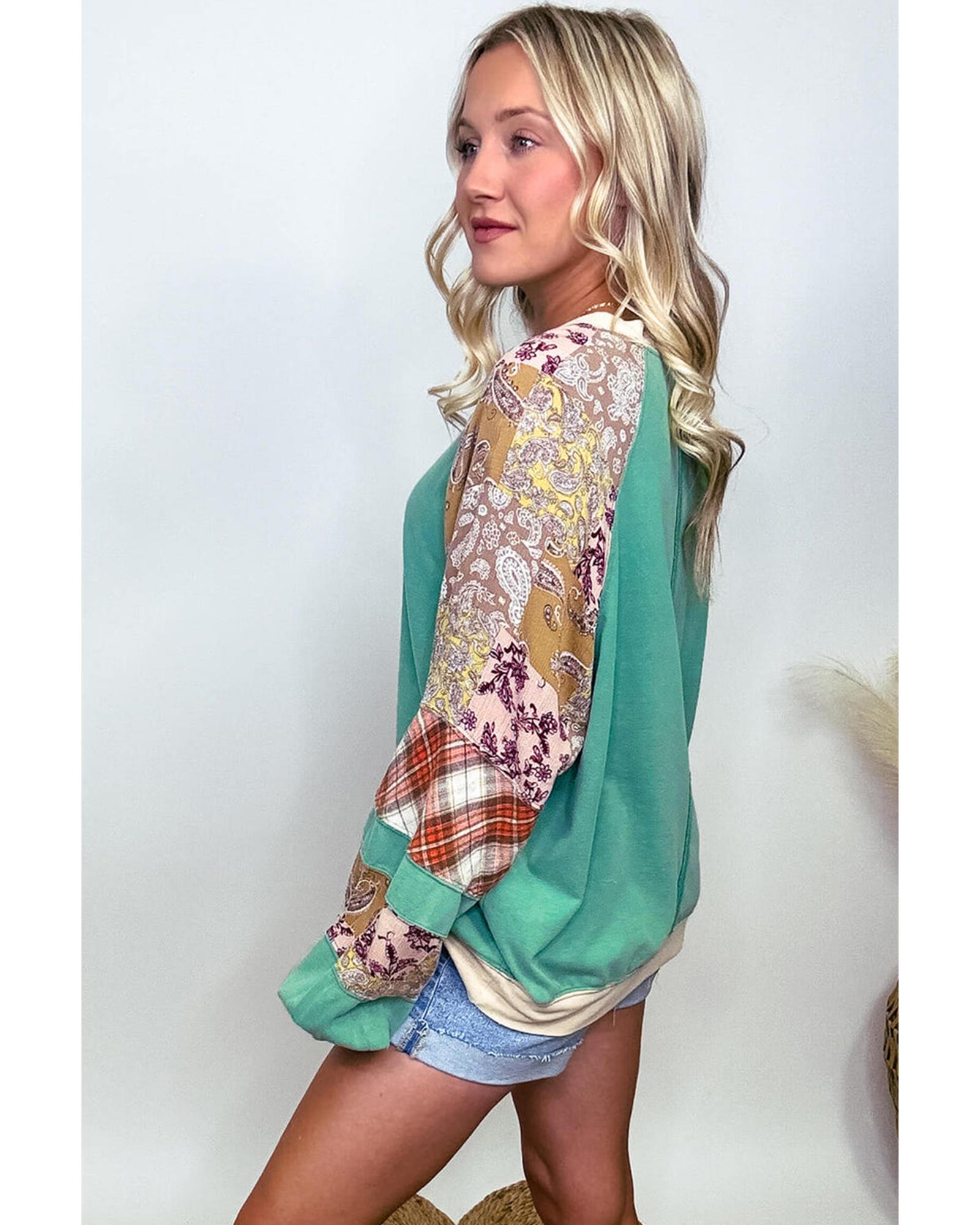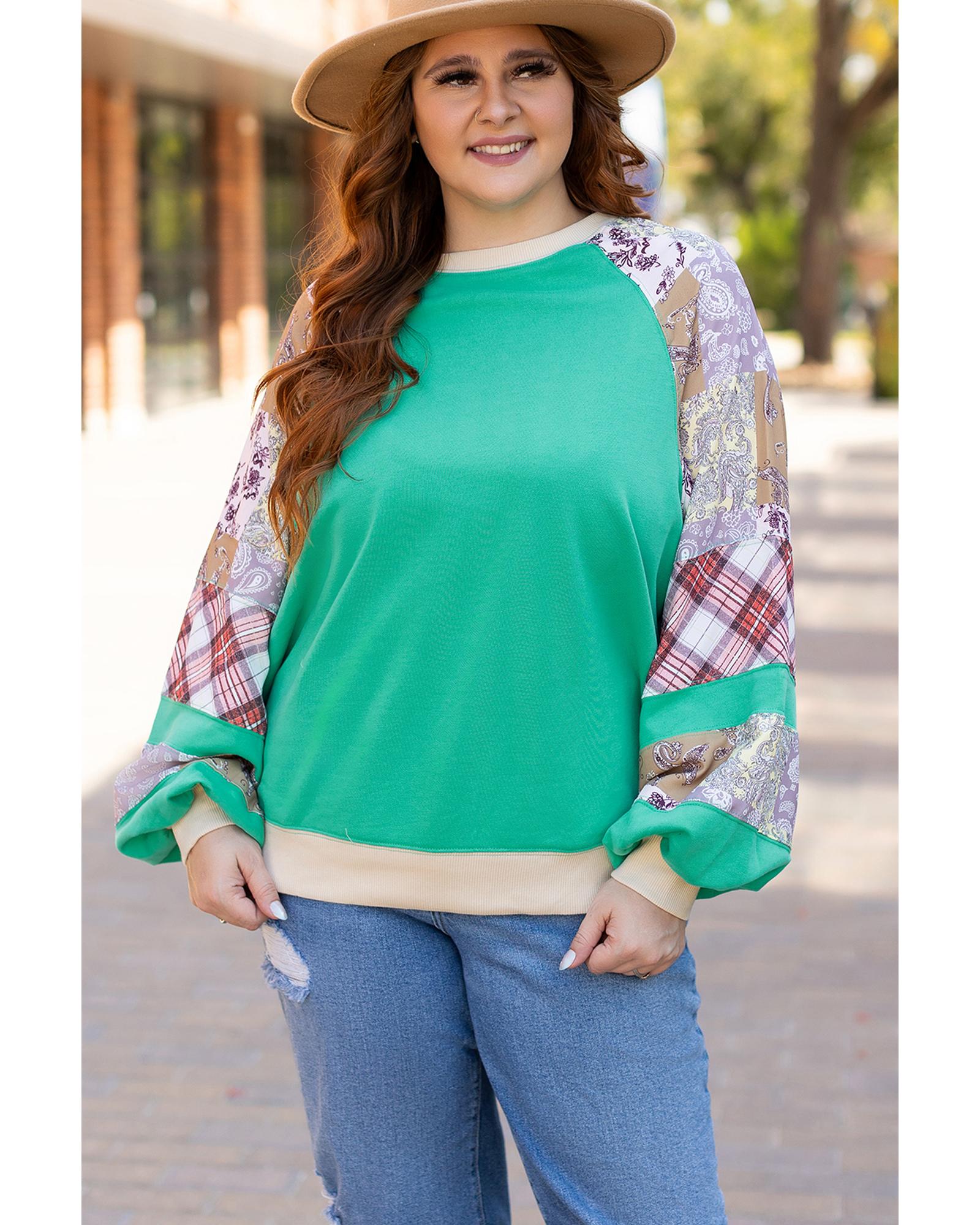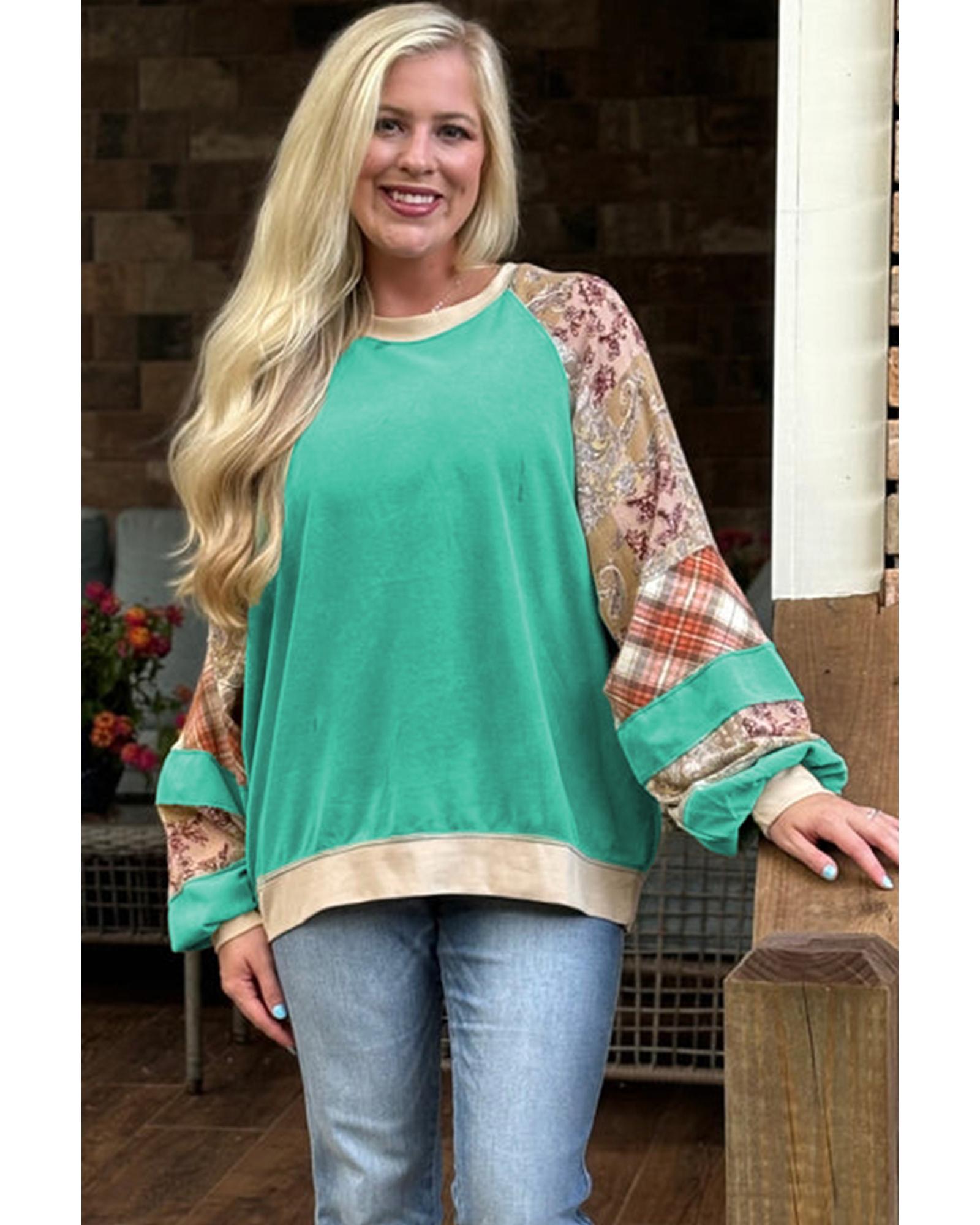 Sky Blue Plus Size Plaid Floral Patchwork Raglan Sleeve Sweatshirt – 3X