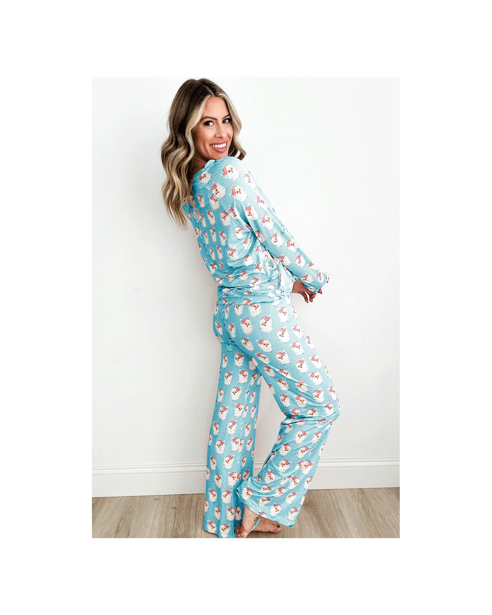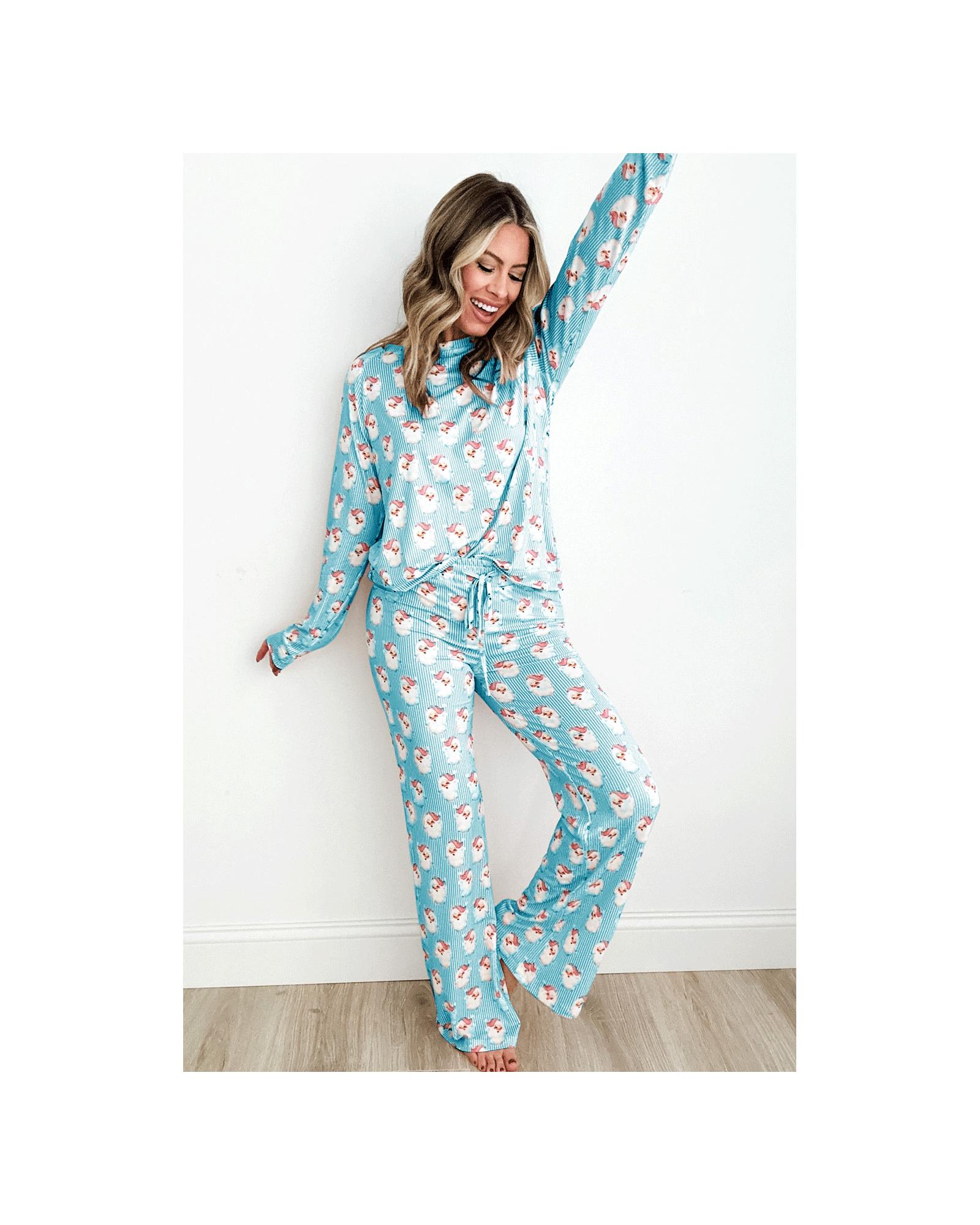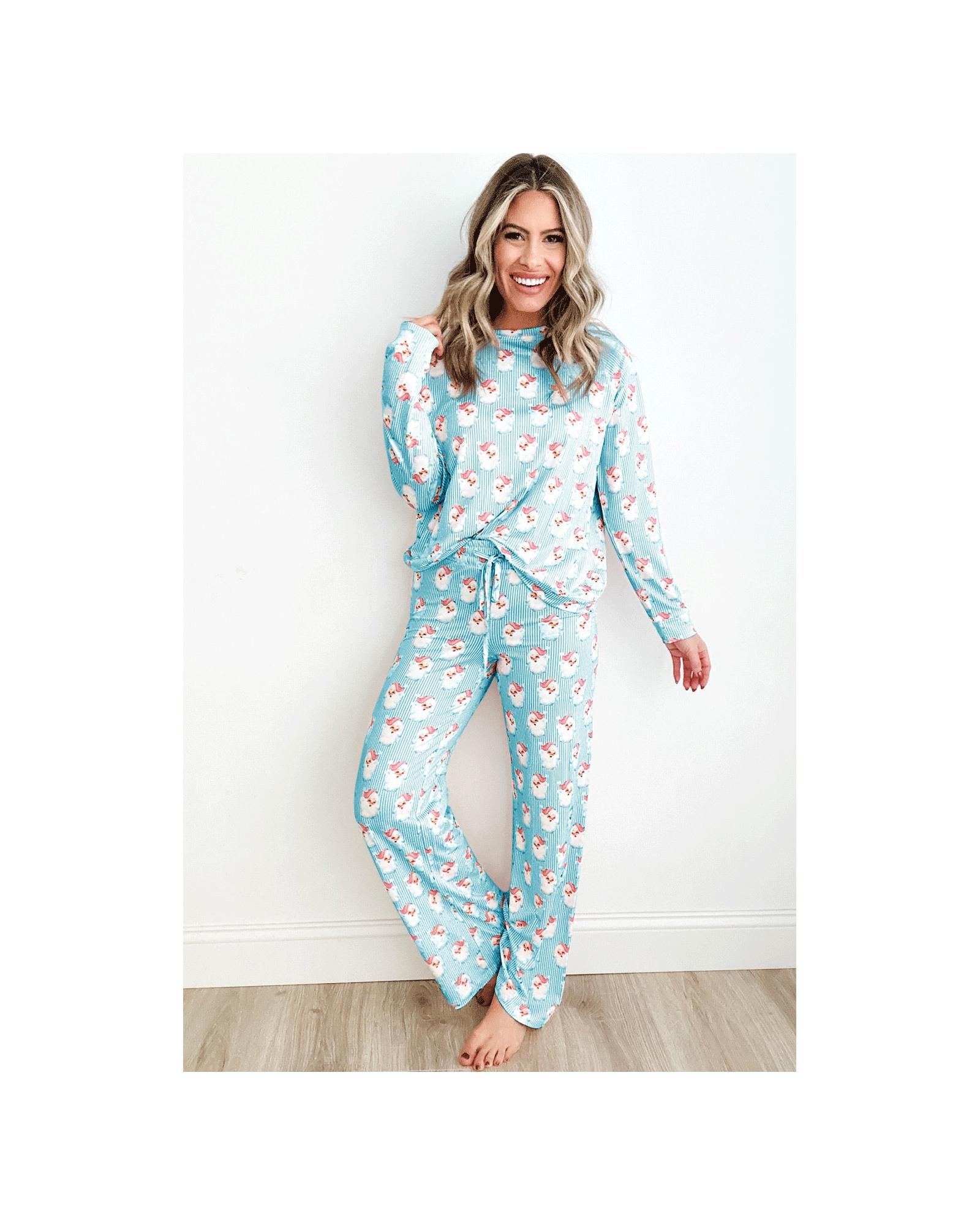 - Sky Blue Santa Claus Striped Print Loose Fit Two Piece Lounge Set