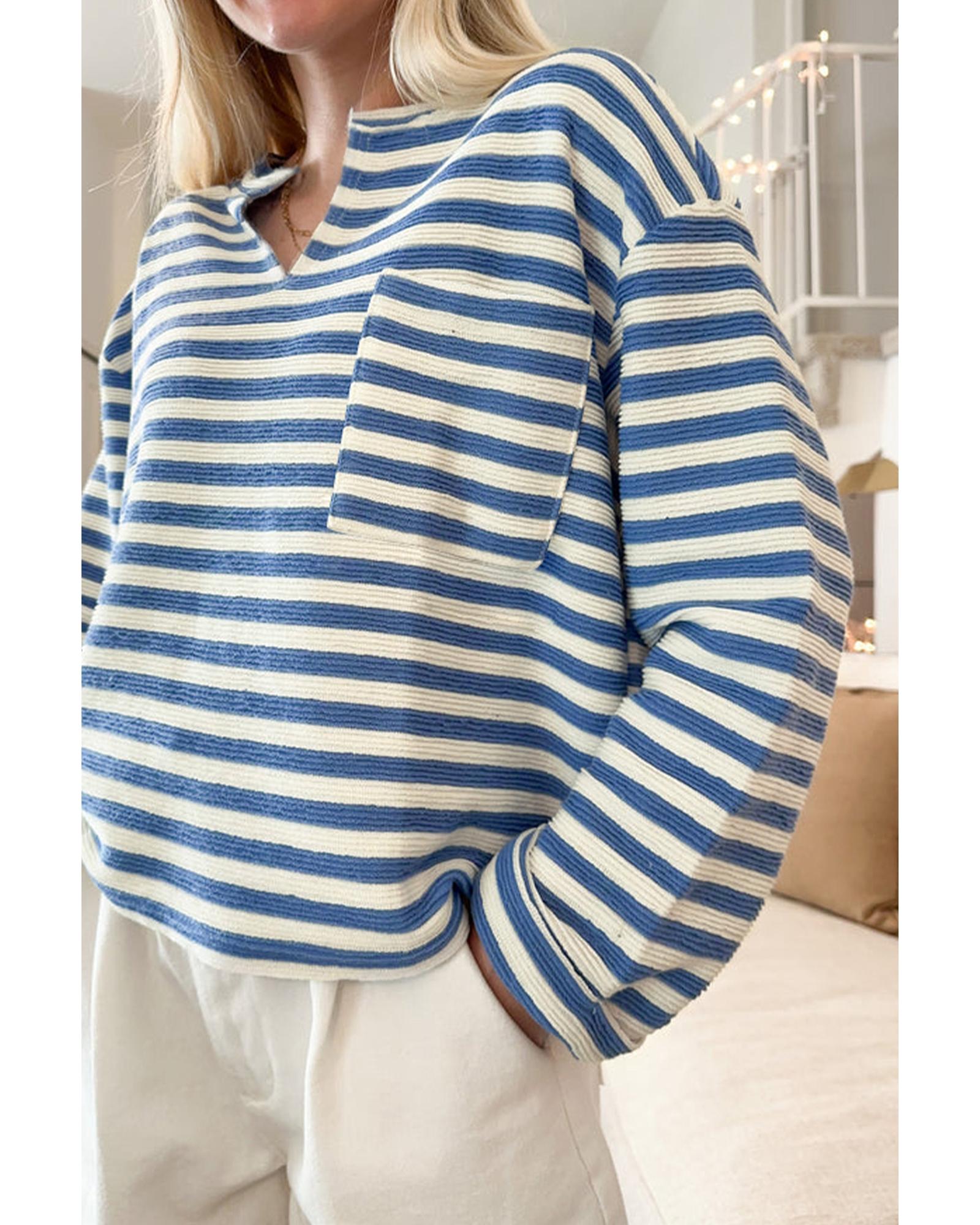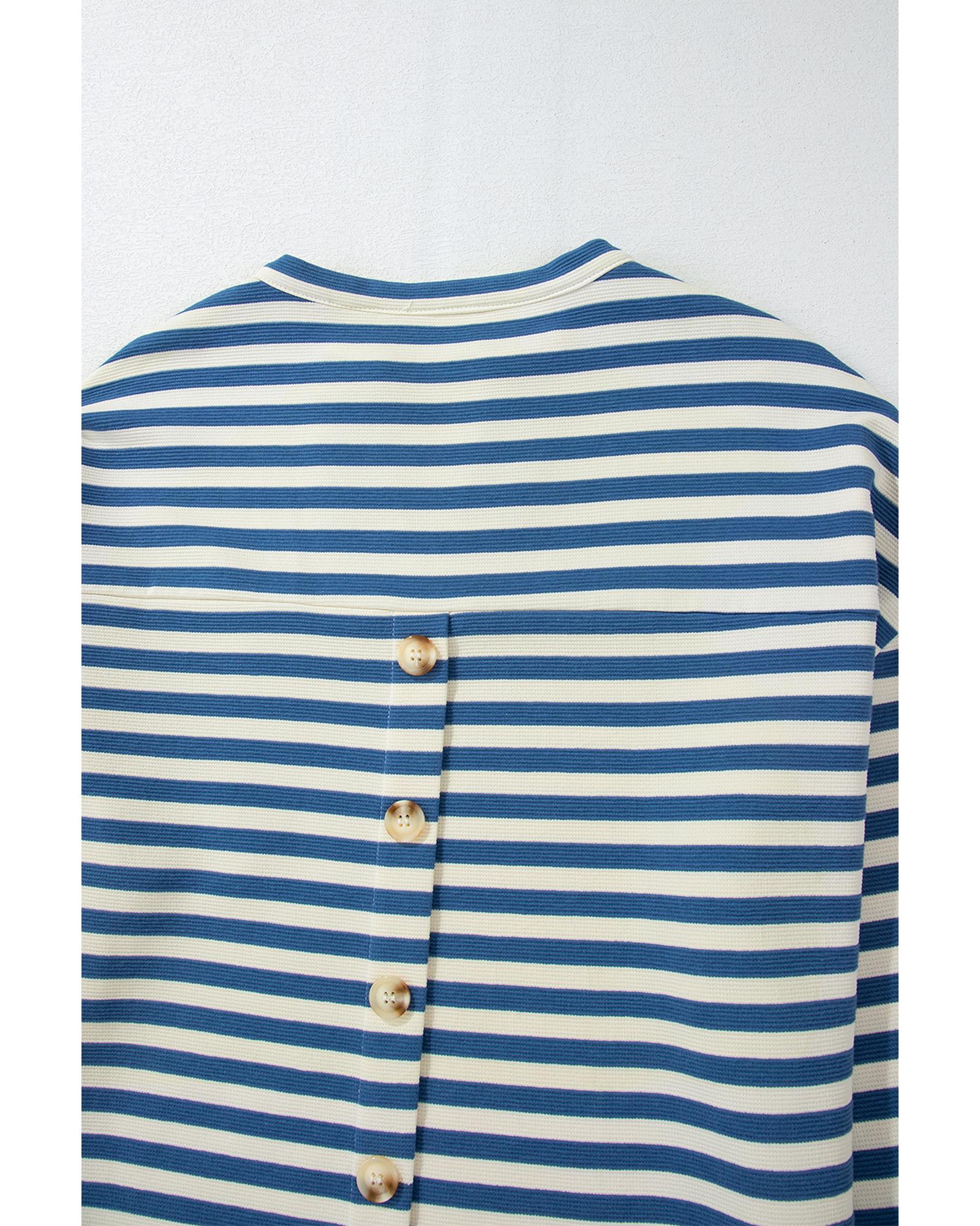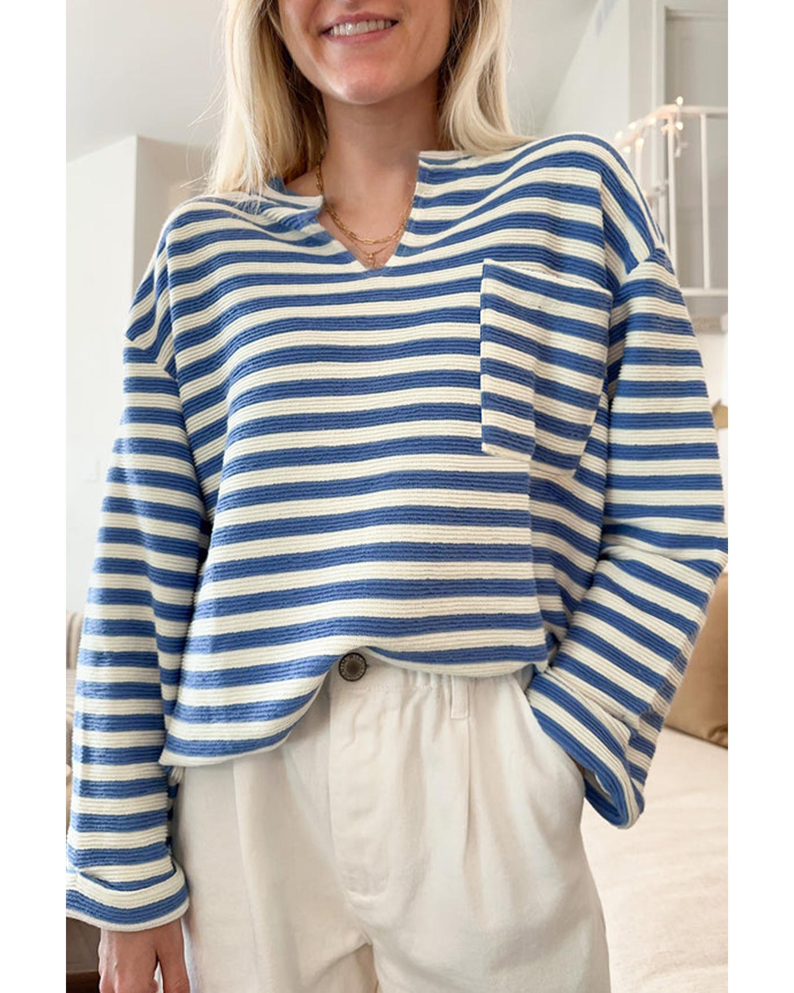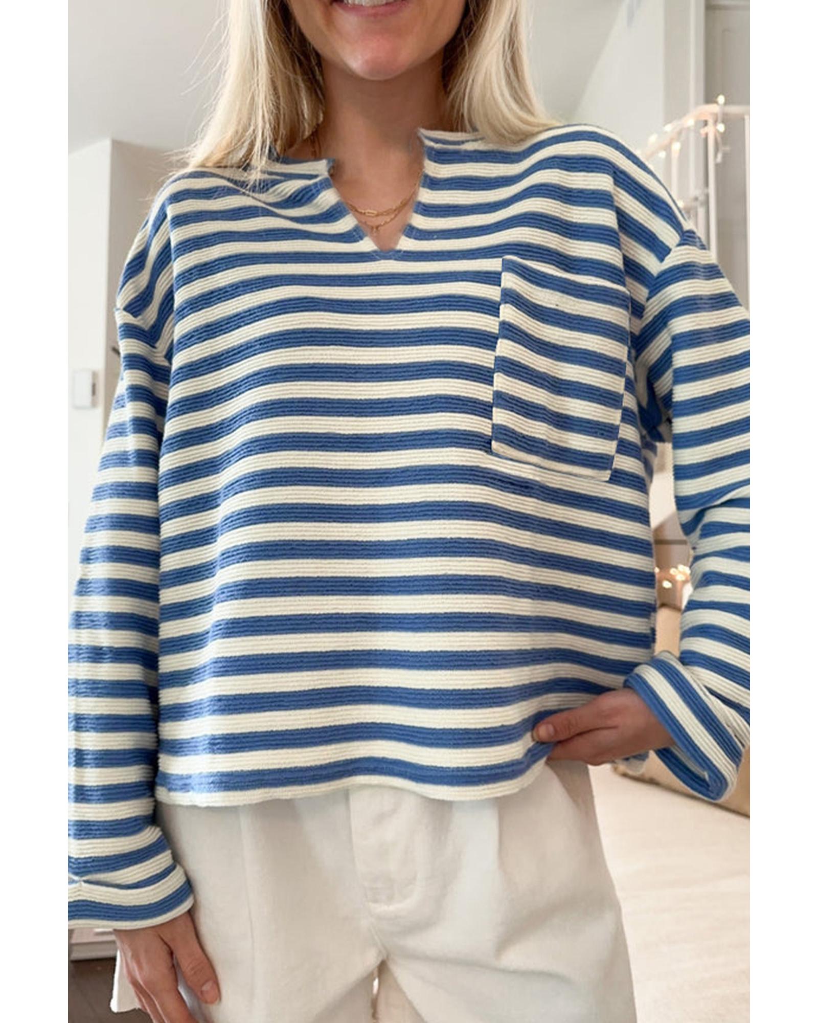 Sky Blue Stripe Chest Pocket Buttoned Back Notched V Neck Top – S
