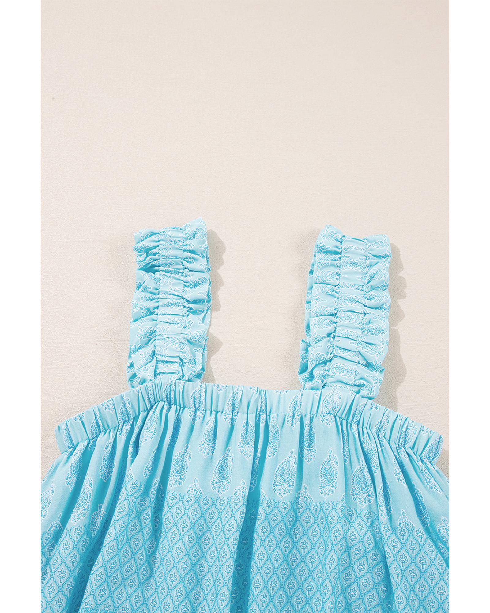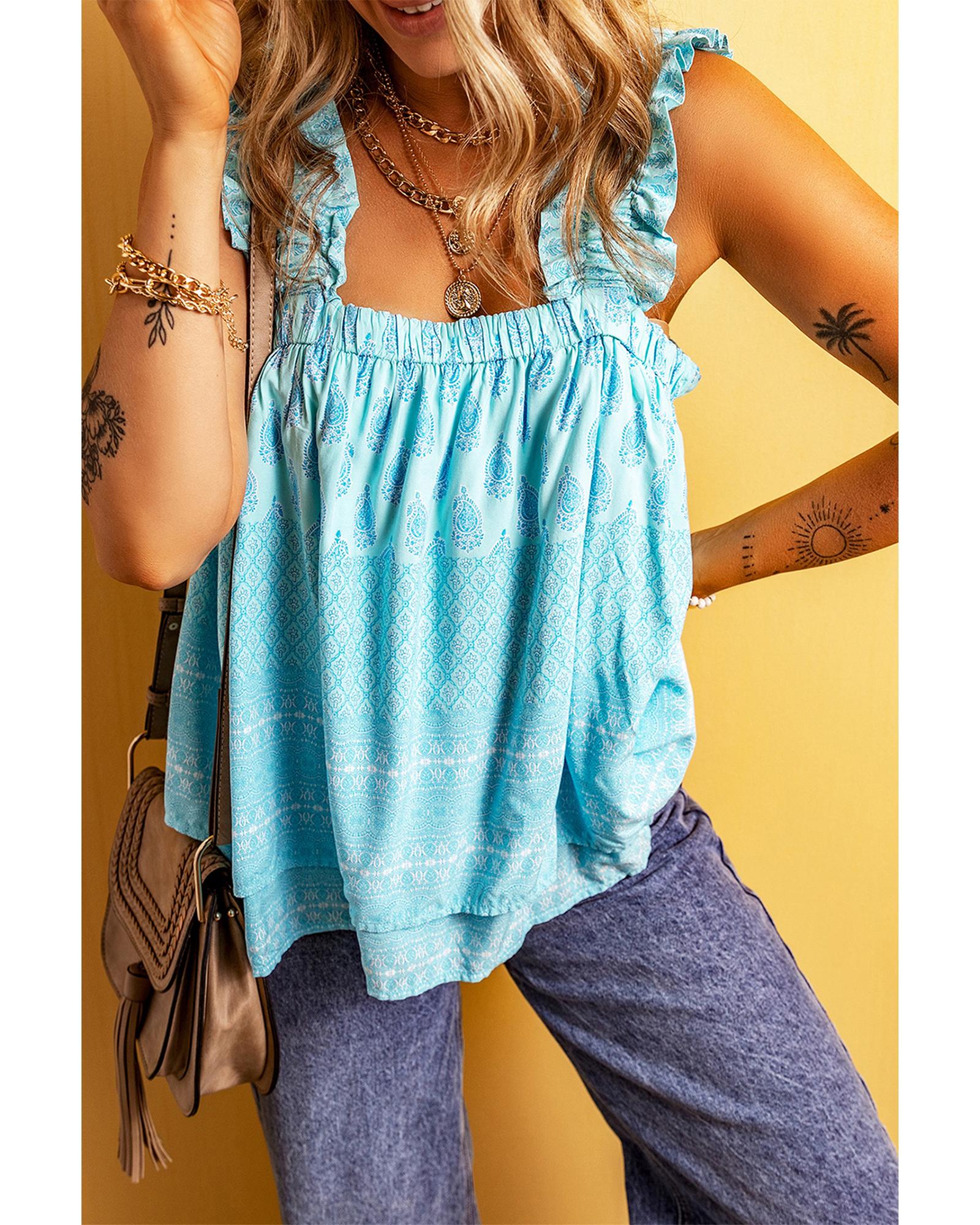 Sky Blue Tribal Pattern Print Ruffled Wide Straps Loose Tank Top – XL