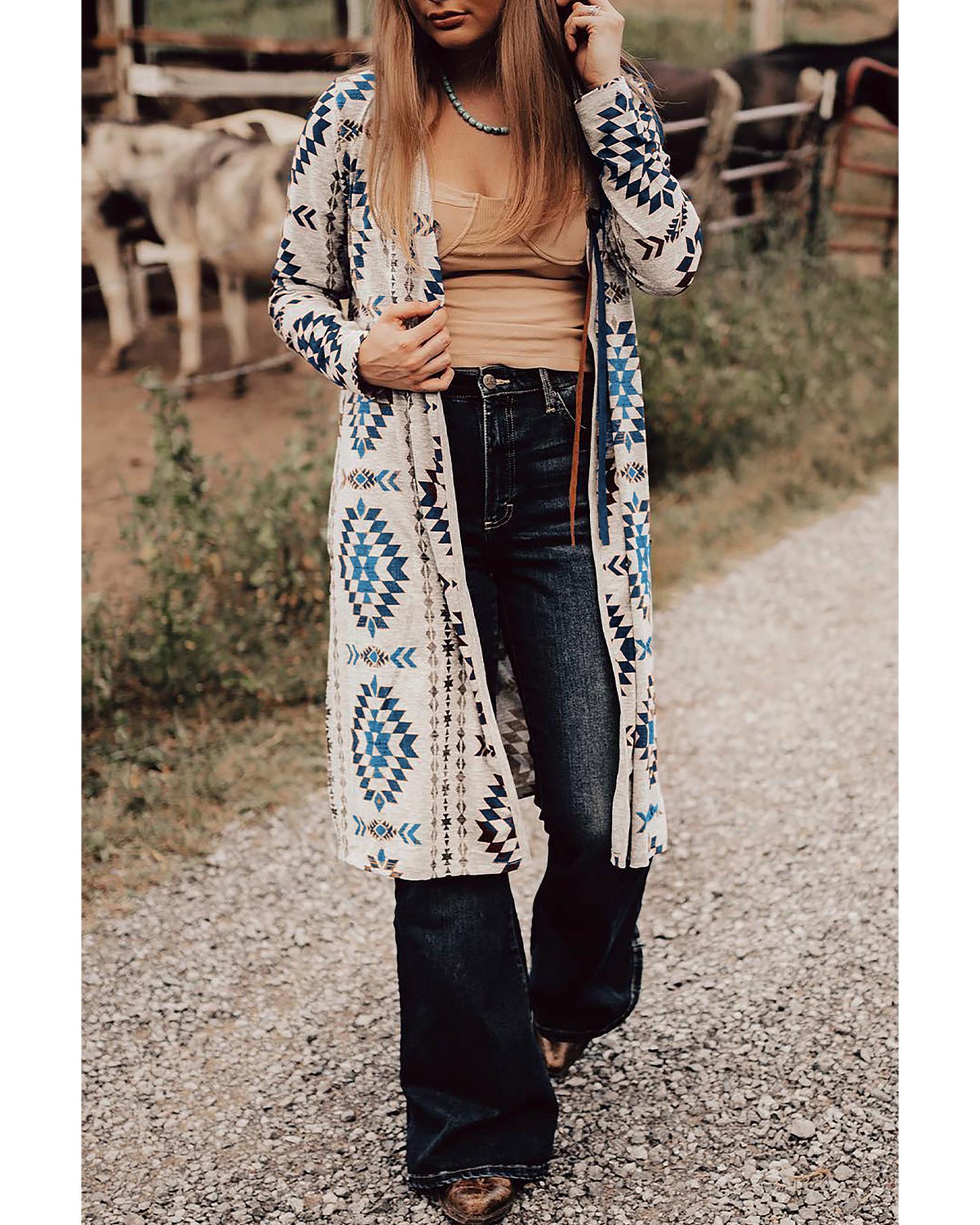 Sky Blue Western Aztec Printed Open Front Long Cardigan – S