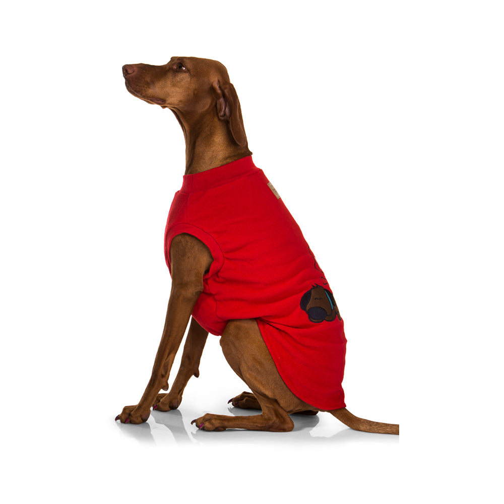 These soft, rich red fleecedog pyjamas with a sleeping dog motif are the bestdog clothesto keep your pooch snugly and warm.