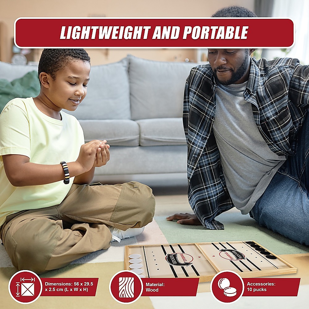 This game is easy to learn even beginners can get up to speed in minutes. Just use a single finger to pull back the inset elastic band to shoot all the pucks into your opponent's court. The winner of each round is the first player to get all their pucks into your opponent's court. The first player to win two rounds wins the game. You don't need to take turns you just keep shooting until all your pucks are on the other side. It's a lot like the ever-popular foosball, but in a hockey setting. It's an excellent gift for the table game lover in your life.