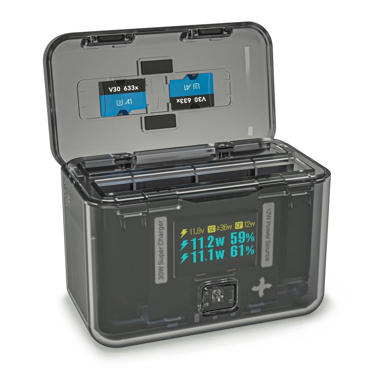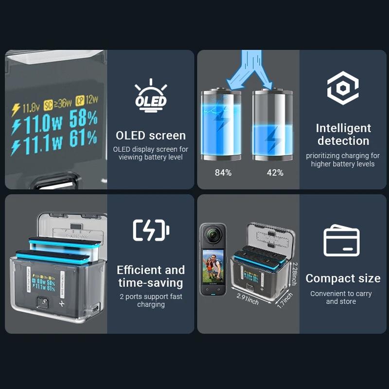 • Suitable for Insta360 X4 action camera two-way charging butler, can accommodate 2 batteries for charging, and can also use battery power to charge mobile devices