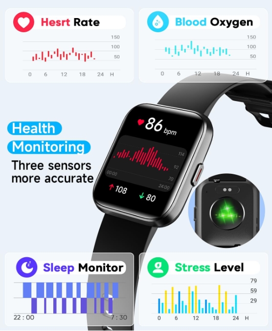 Sleep, sedentary reminder, heart rate/blood pressure/blood oxygen monitoring.