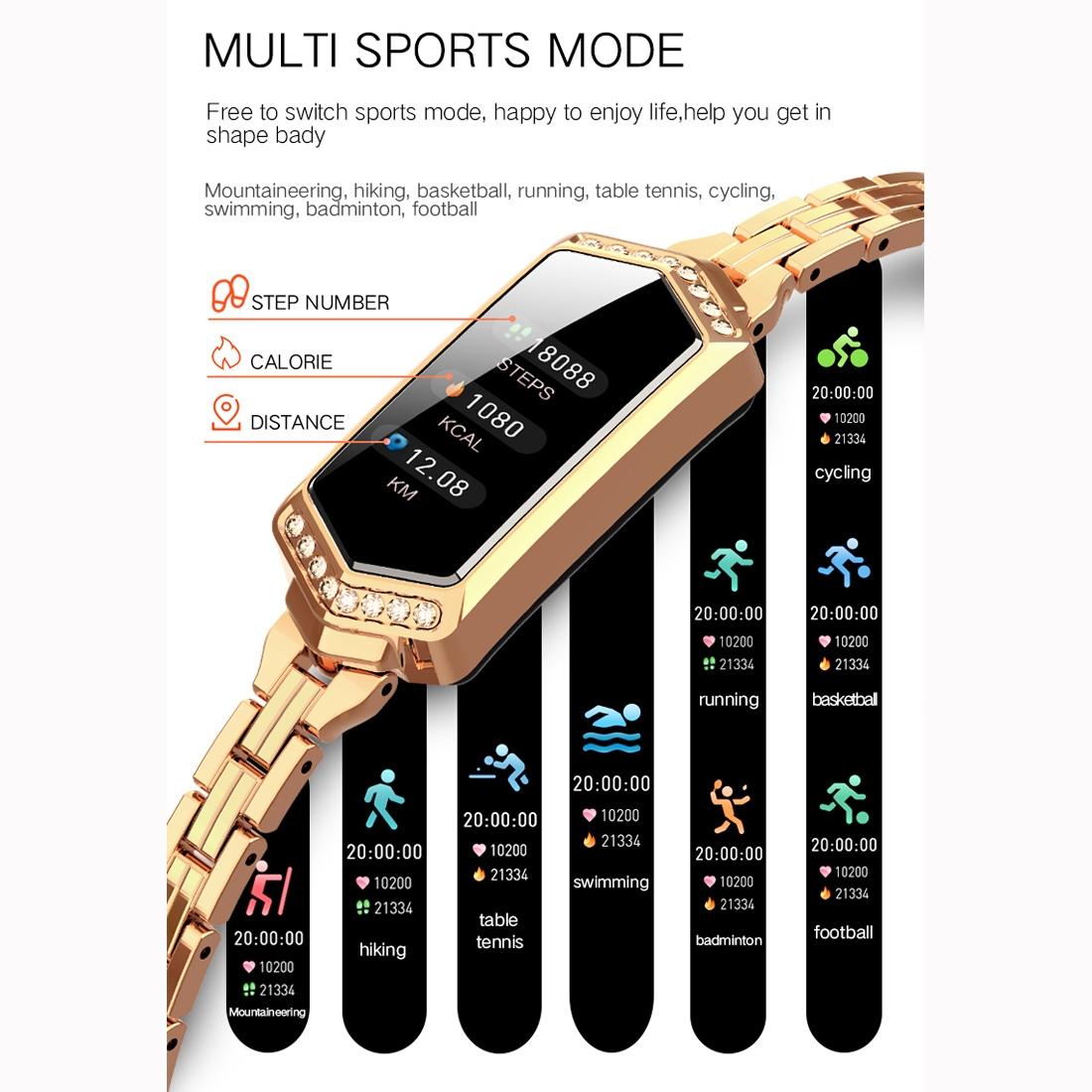 • Standard sports functions (step count, distance, and calories burned) and multiple sports modes (climbing, walking, basketball, running, table tennis, cycling, swimming, badminton, and football)