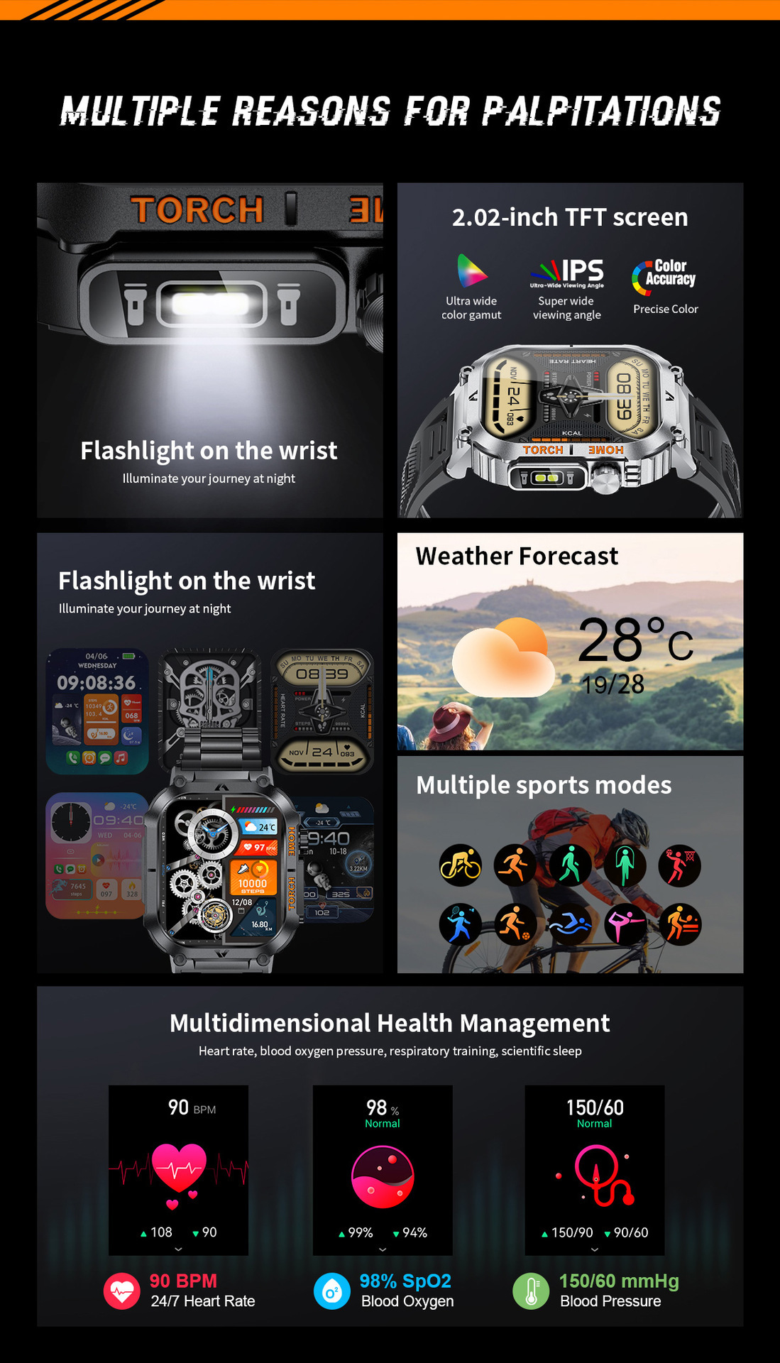 - Functions: Heart Rate Monitor, Blood Oxygen Monitor, Wireless Calling, Pedometer, Calorie Counter, Distance Tracker, Sleep Monitor, Flashlight, Compass, Information Notifications, Multiple Watch Faces.