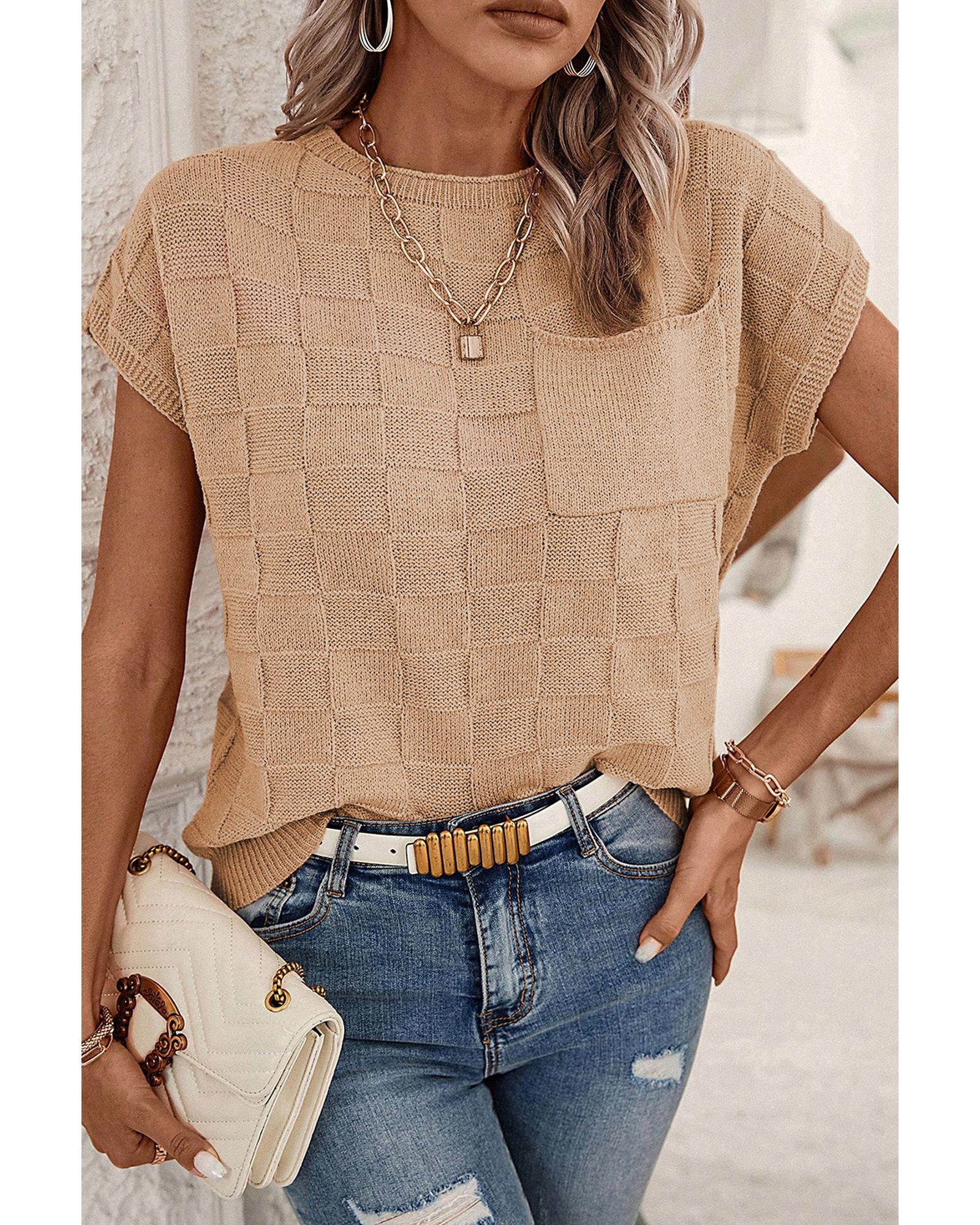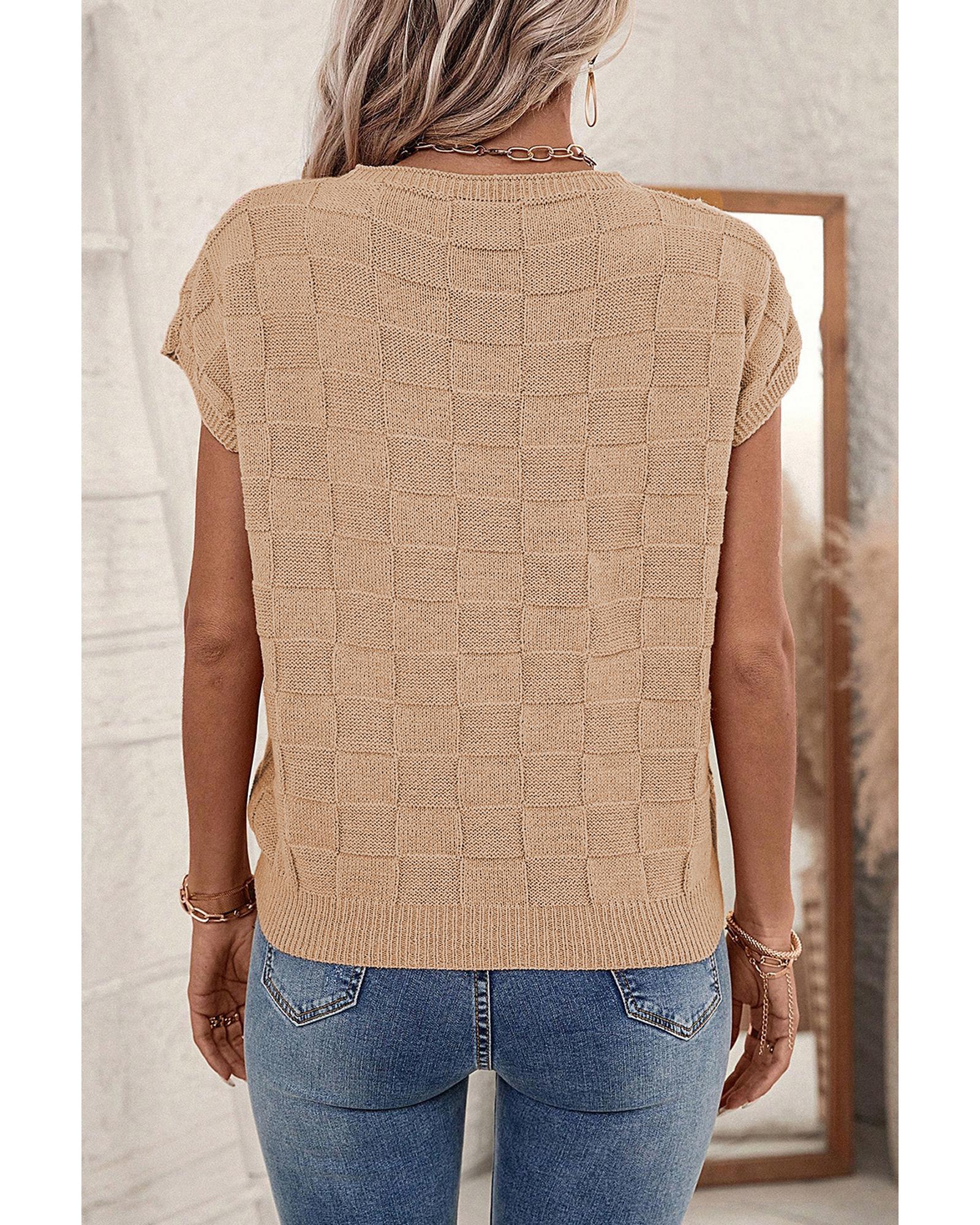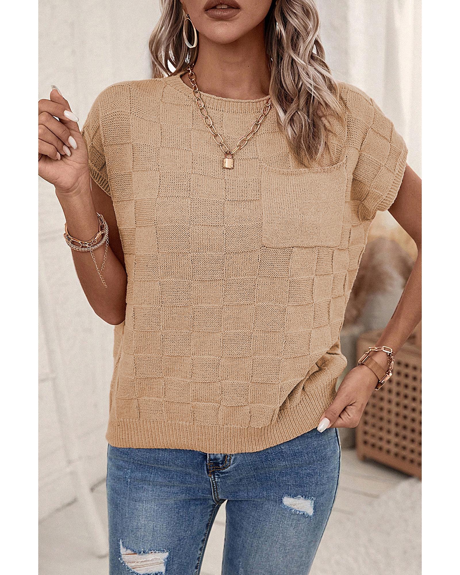 - Smoke Gray Lattice Textured Knit Short Sleeve Sweater