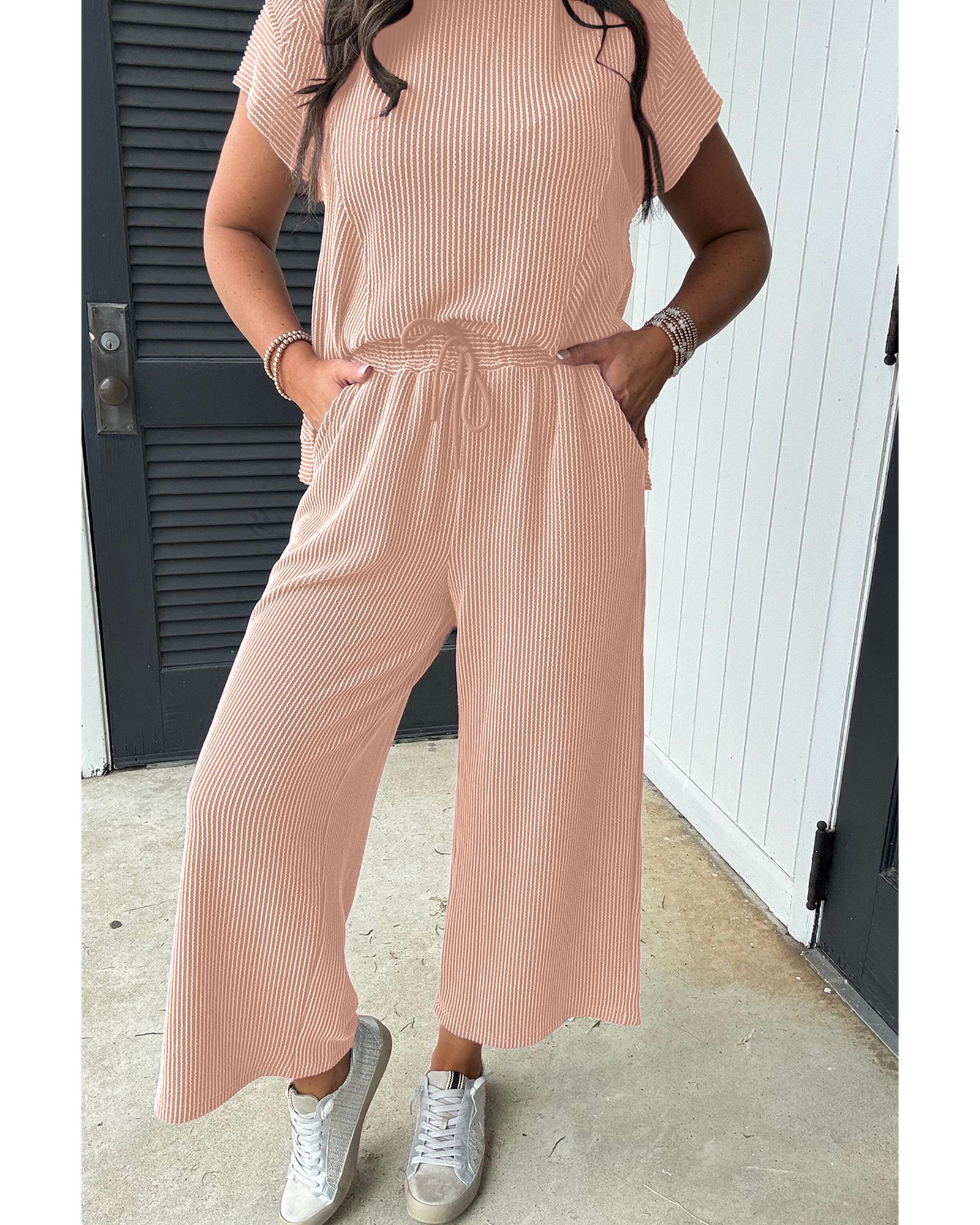 Smoke Gray Solid Corded Knit Short Sleeve T Shirt and Wide Leg Pants Set – S