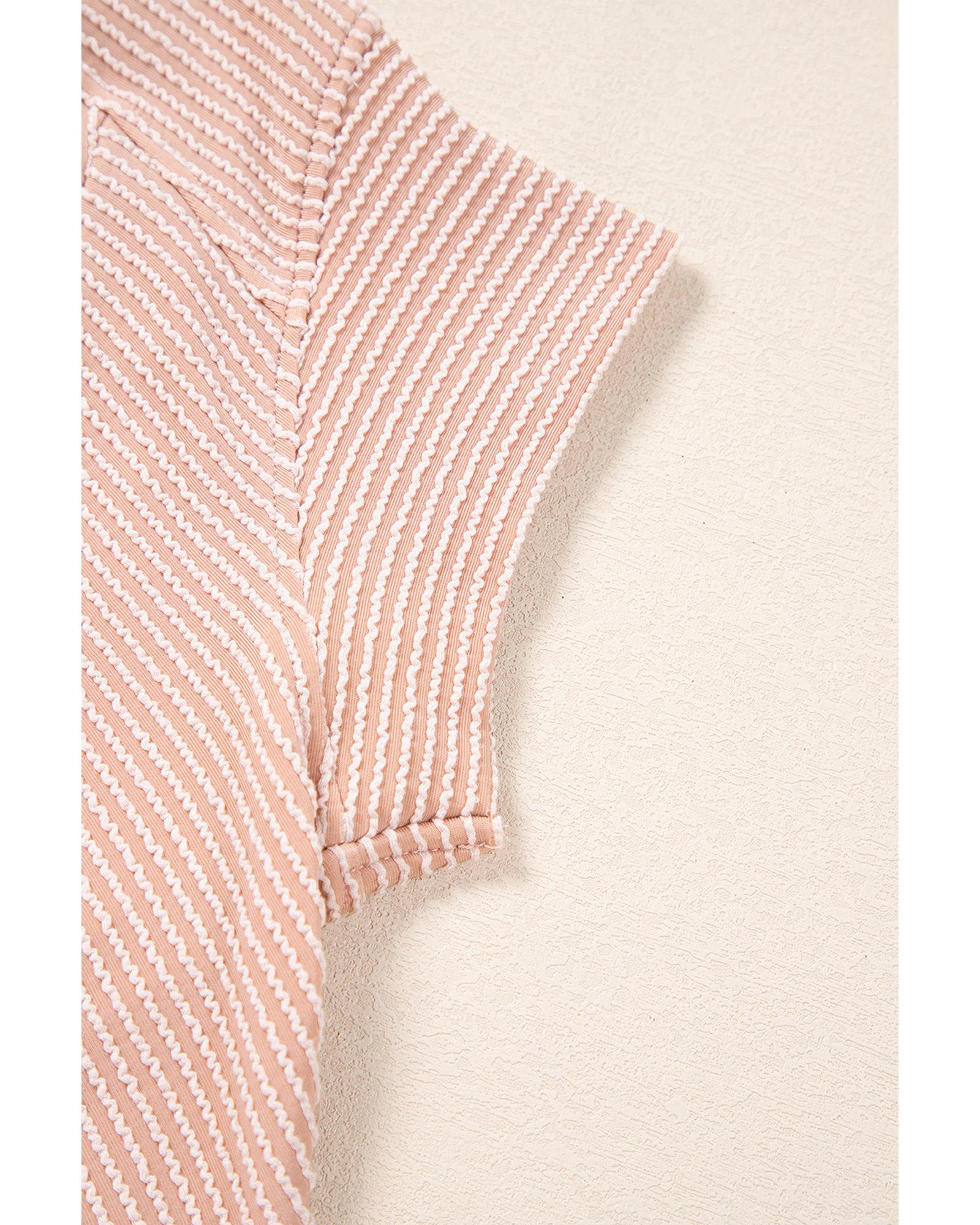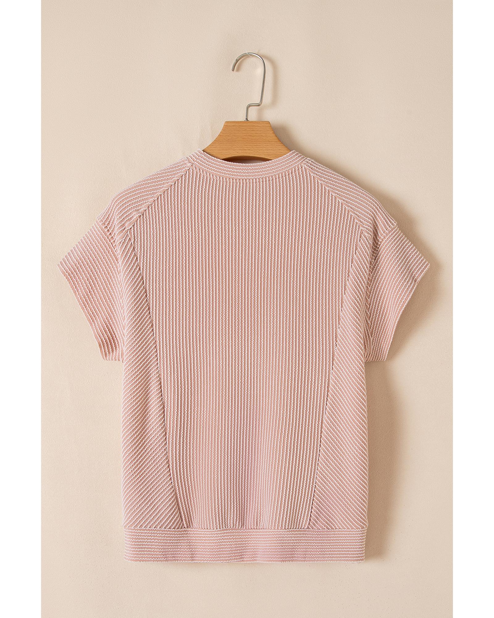 Pink Corded Colorblock Patchwork Short Sleeve Top and Loose Pants Set - M