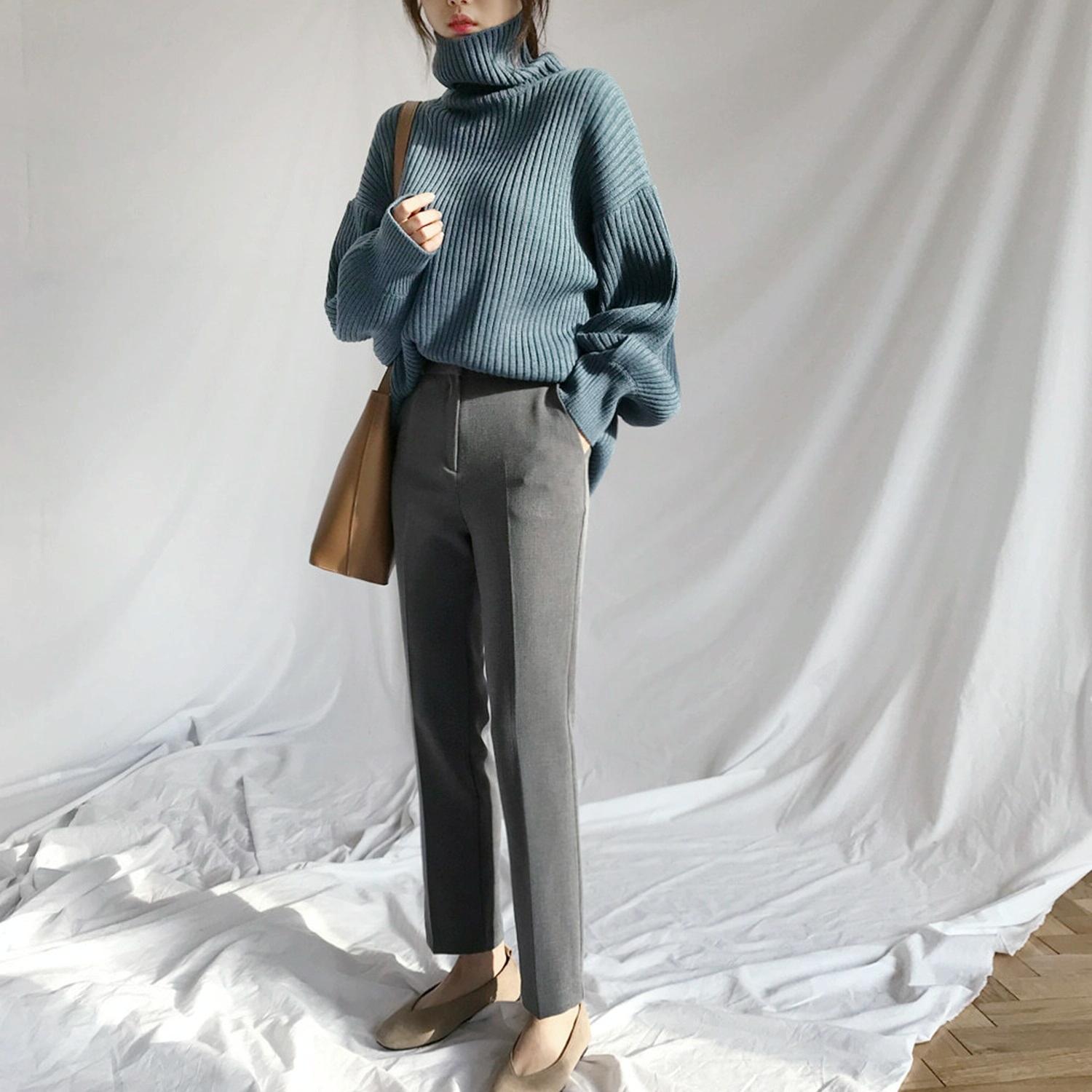 Solid Colour Turtleneck Outer Wear Pullover Casual Sweater Beige – Free Size – Blue Grey Free Size