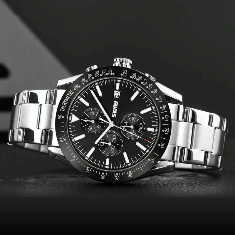 Stainless Steel Strap Quartz Watch for Men with Date and Six Pin Design – Silver Black