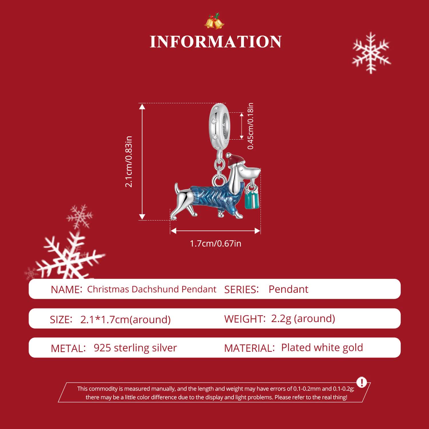 Sterling Silver Dachshund Charm – Festive Christmas Pendant with Colorful Accents(weighs approximately 2.2g)