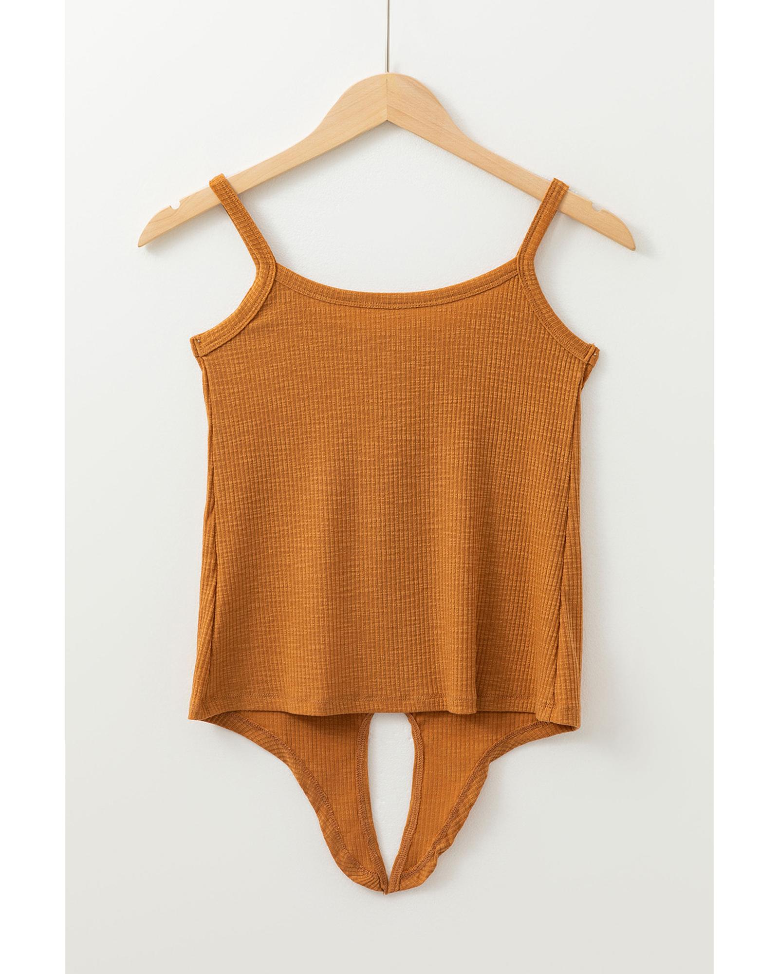 Straw Yellow Ribbed Front Knot Buttoned Thin Strap Tank Top – L