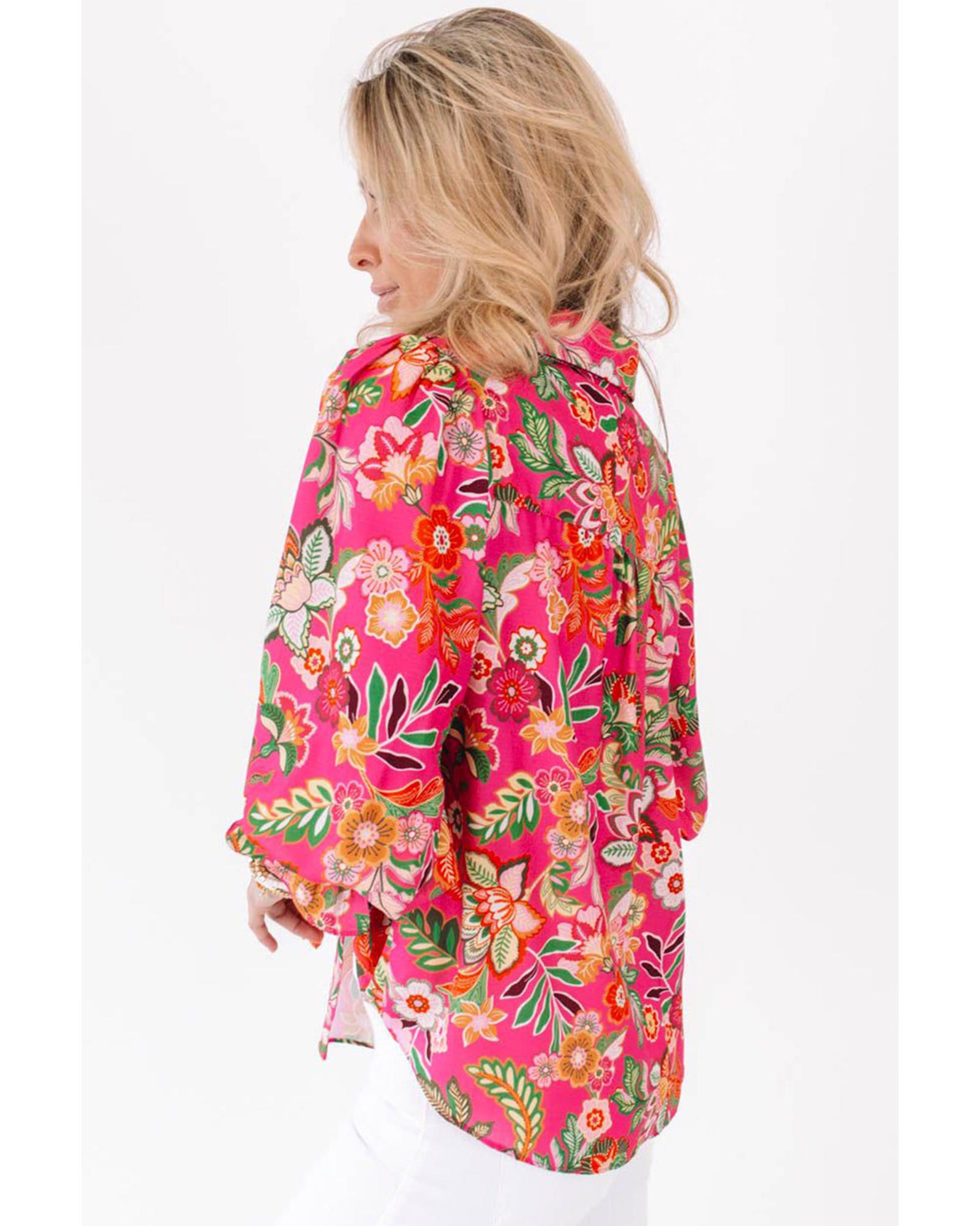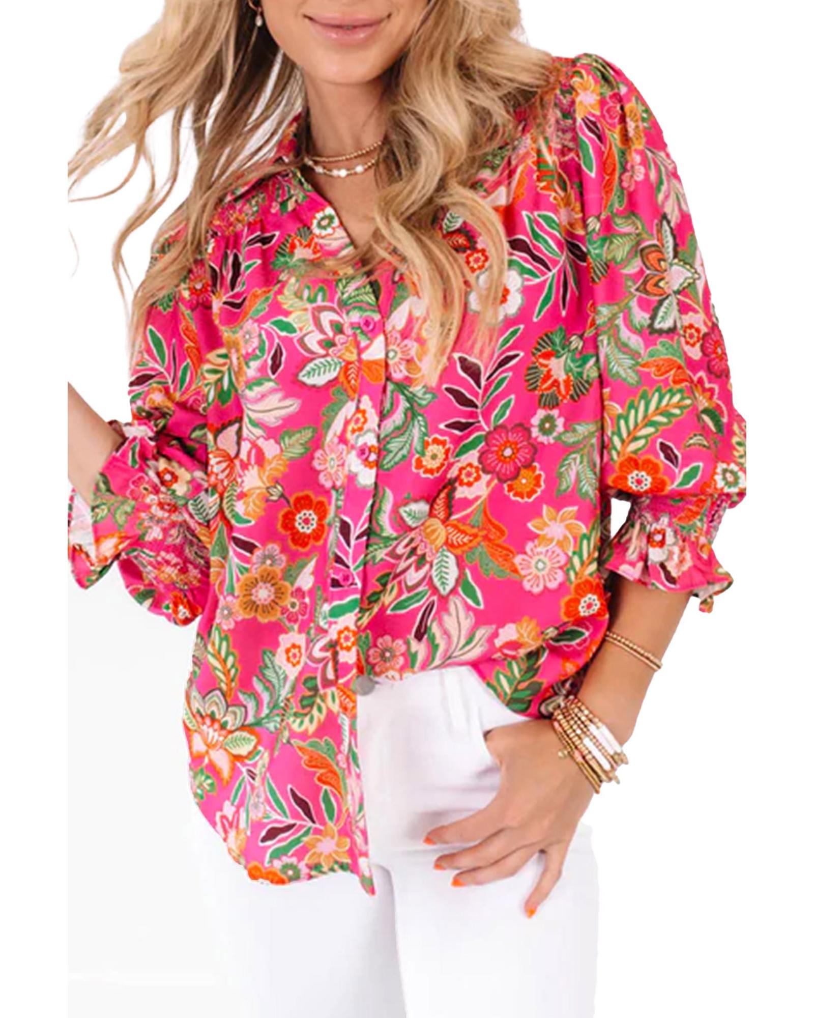 Strawberry Pink Floral Print Smocked Cuff Puff Sleeve Shirt – S
