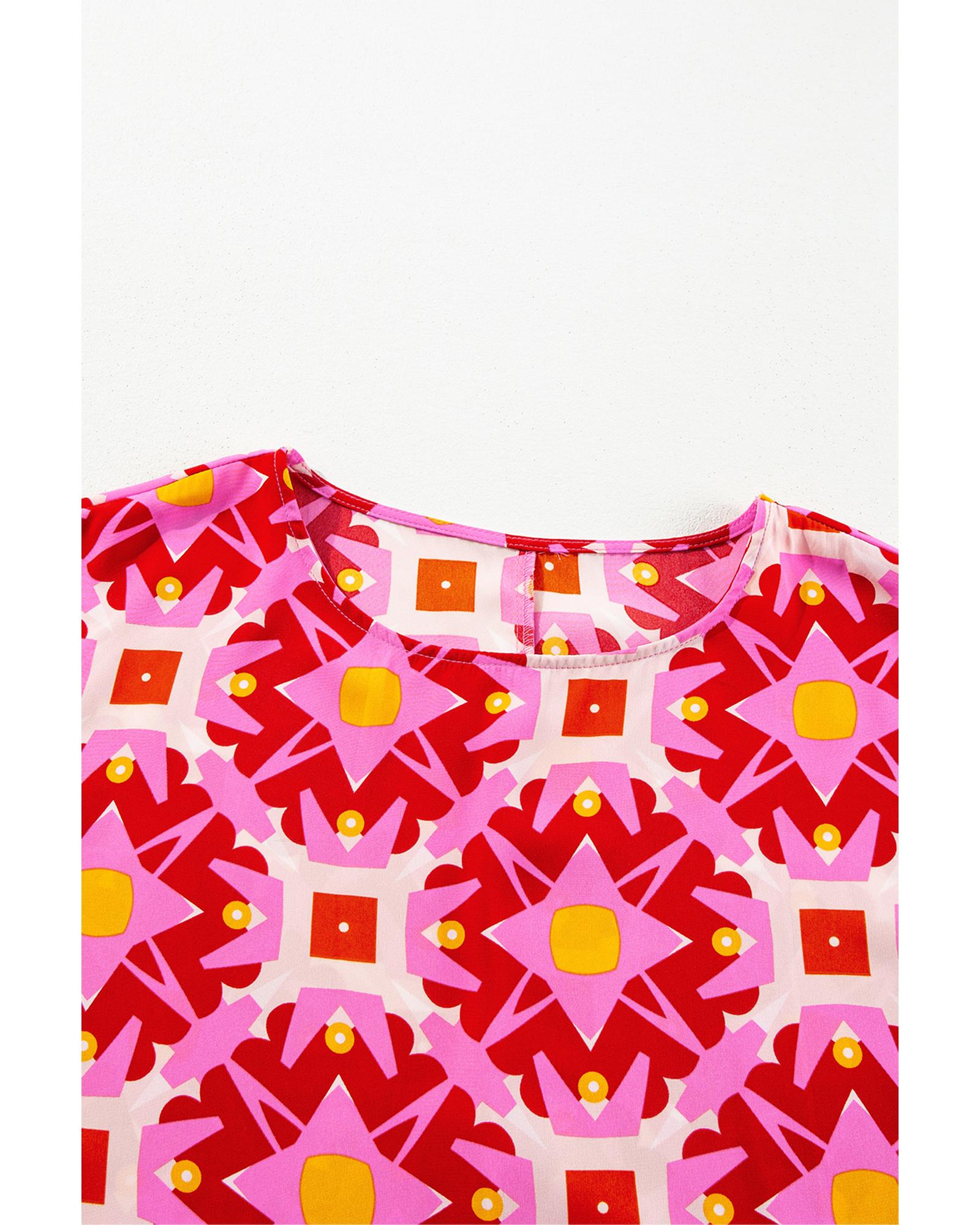 Strawberry Pink Geometric Print Shirred Cuff 3/4 Sleeve Loose Blouse – L