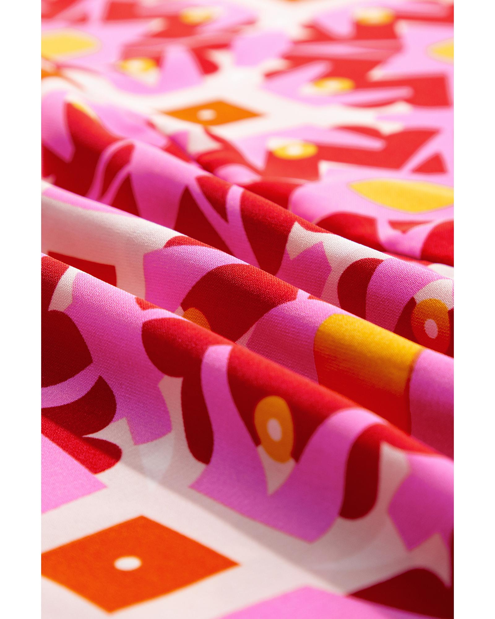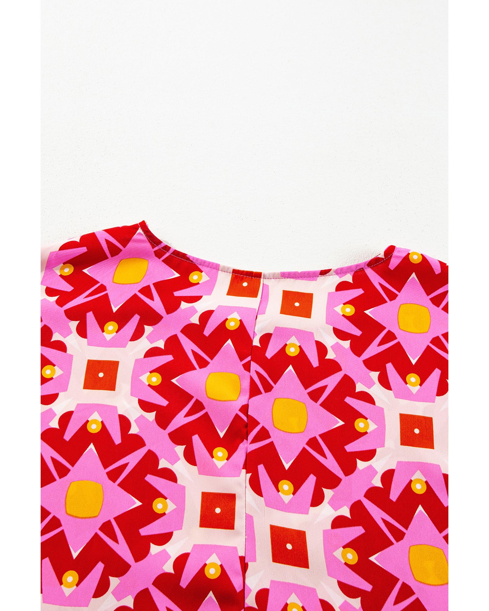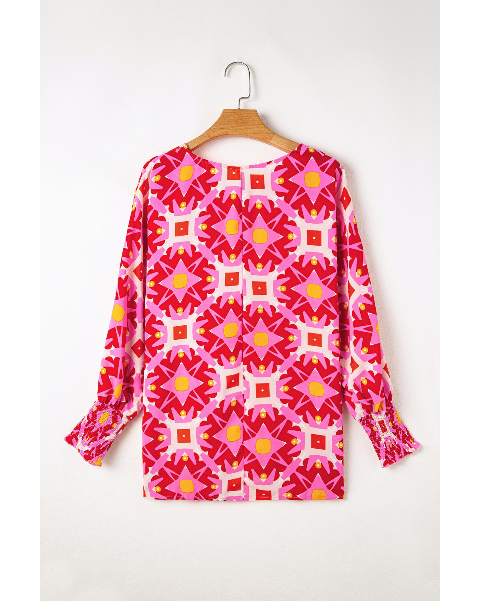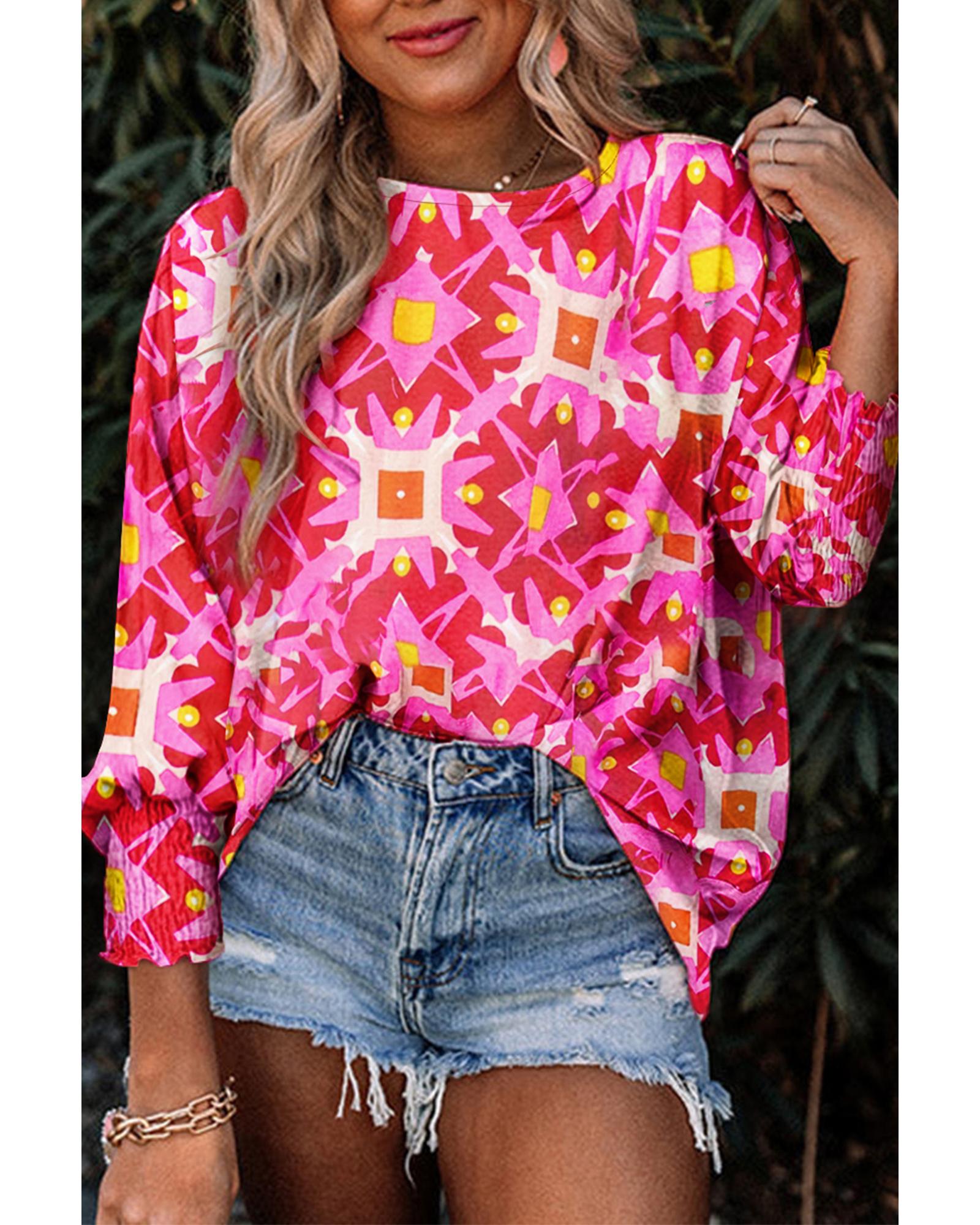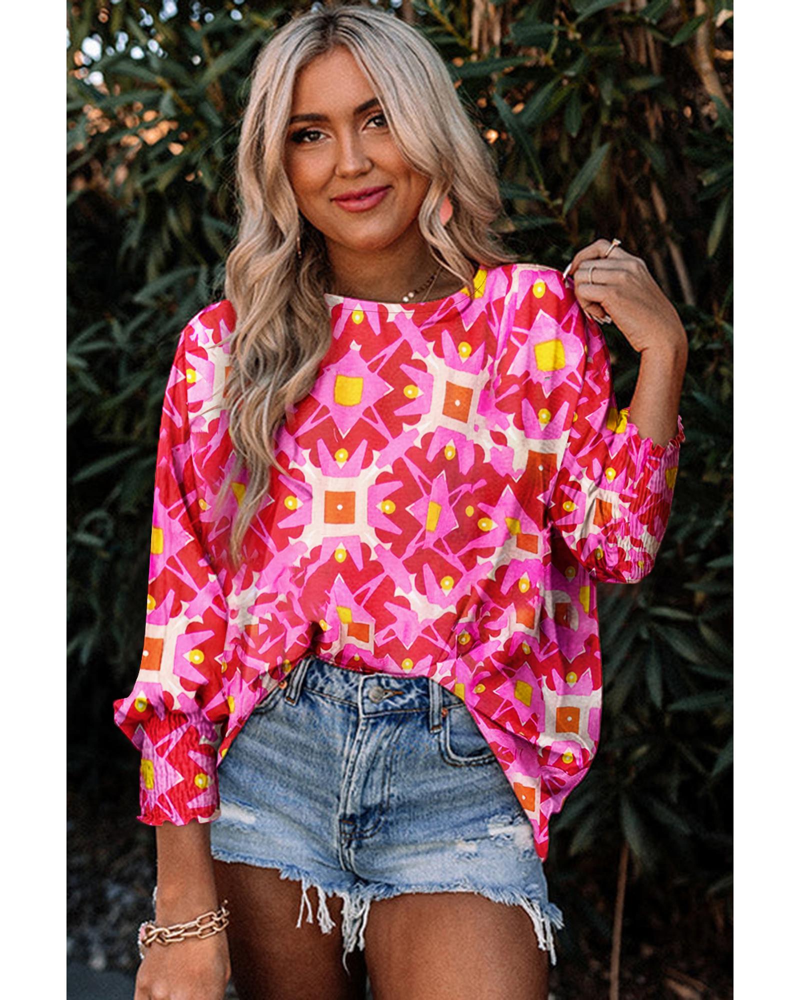 Strawberry Pink Geometric Print Shirred Cuff 3/4 Sleeve Loose Blouse – S