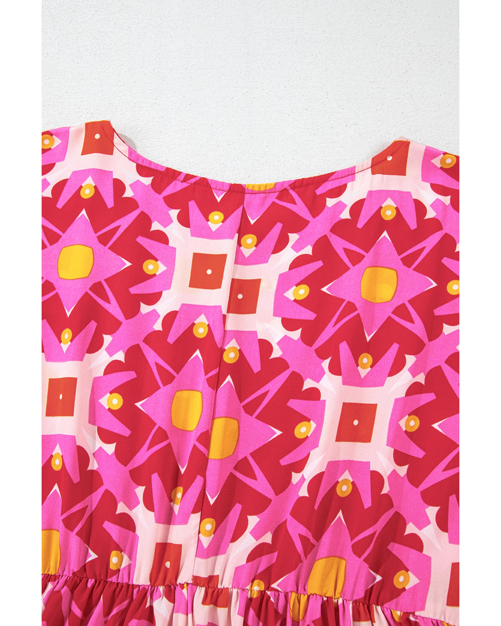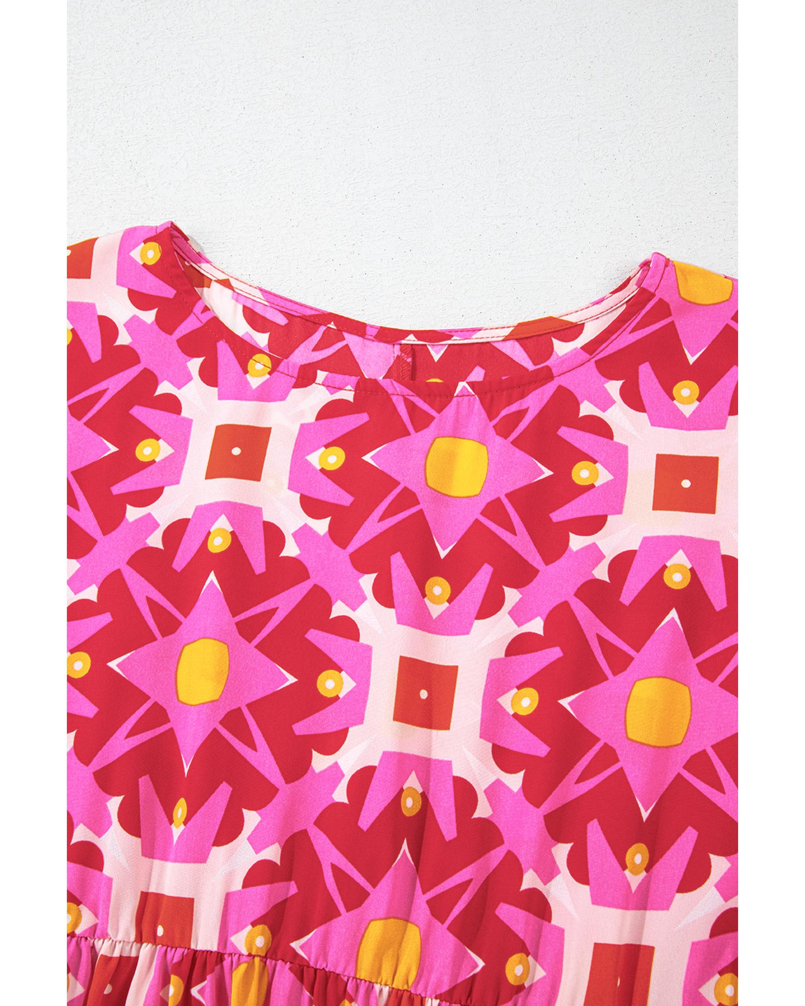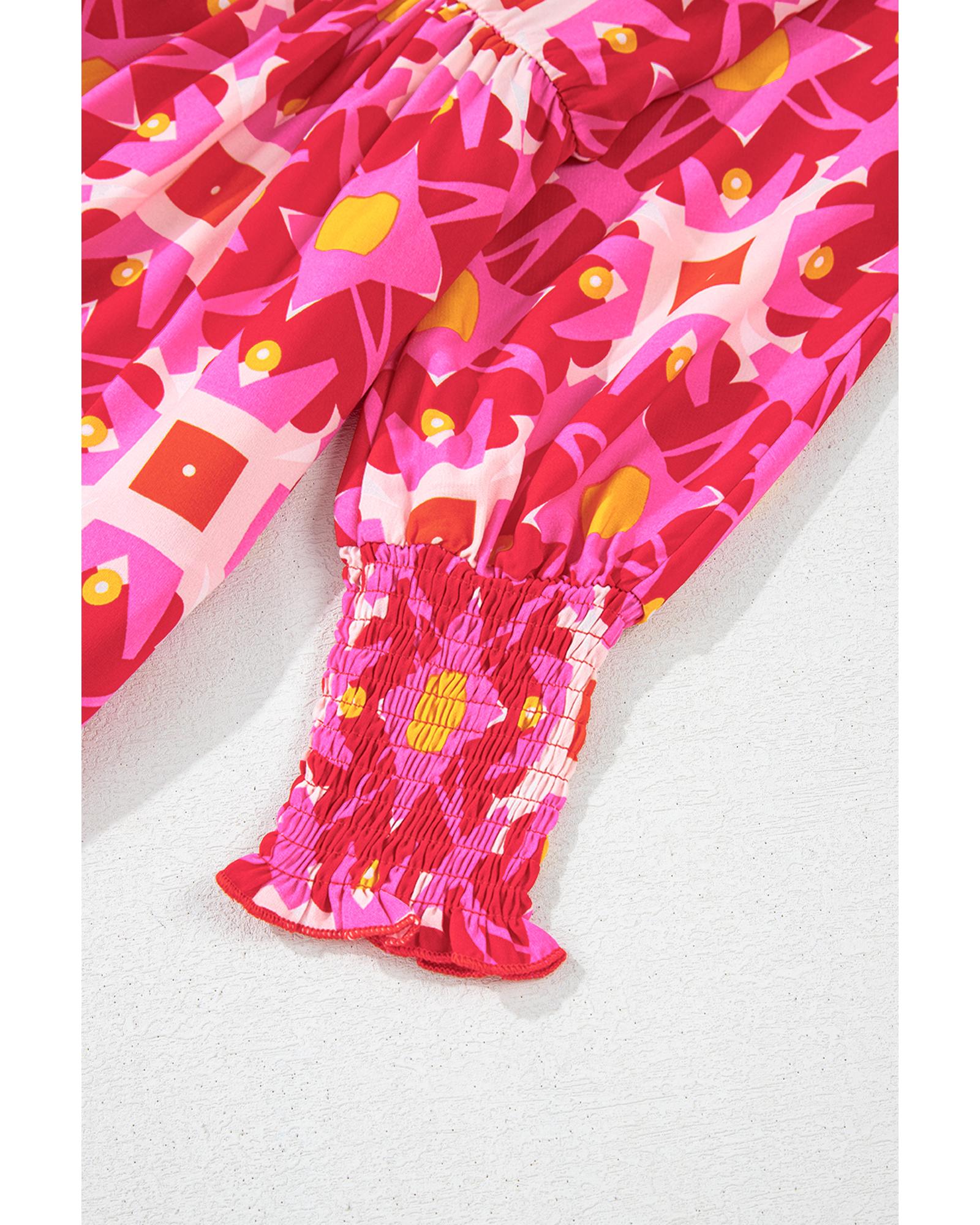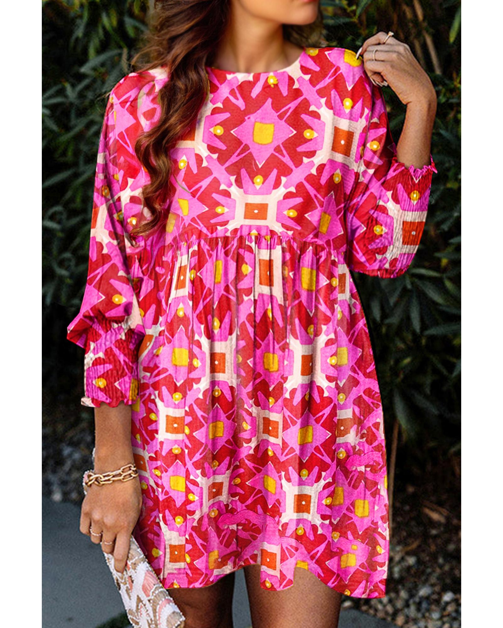 • Strawberry Pink Geometric Print Smocked Long Sleeve Mini Dress