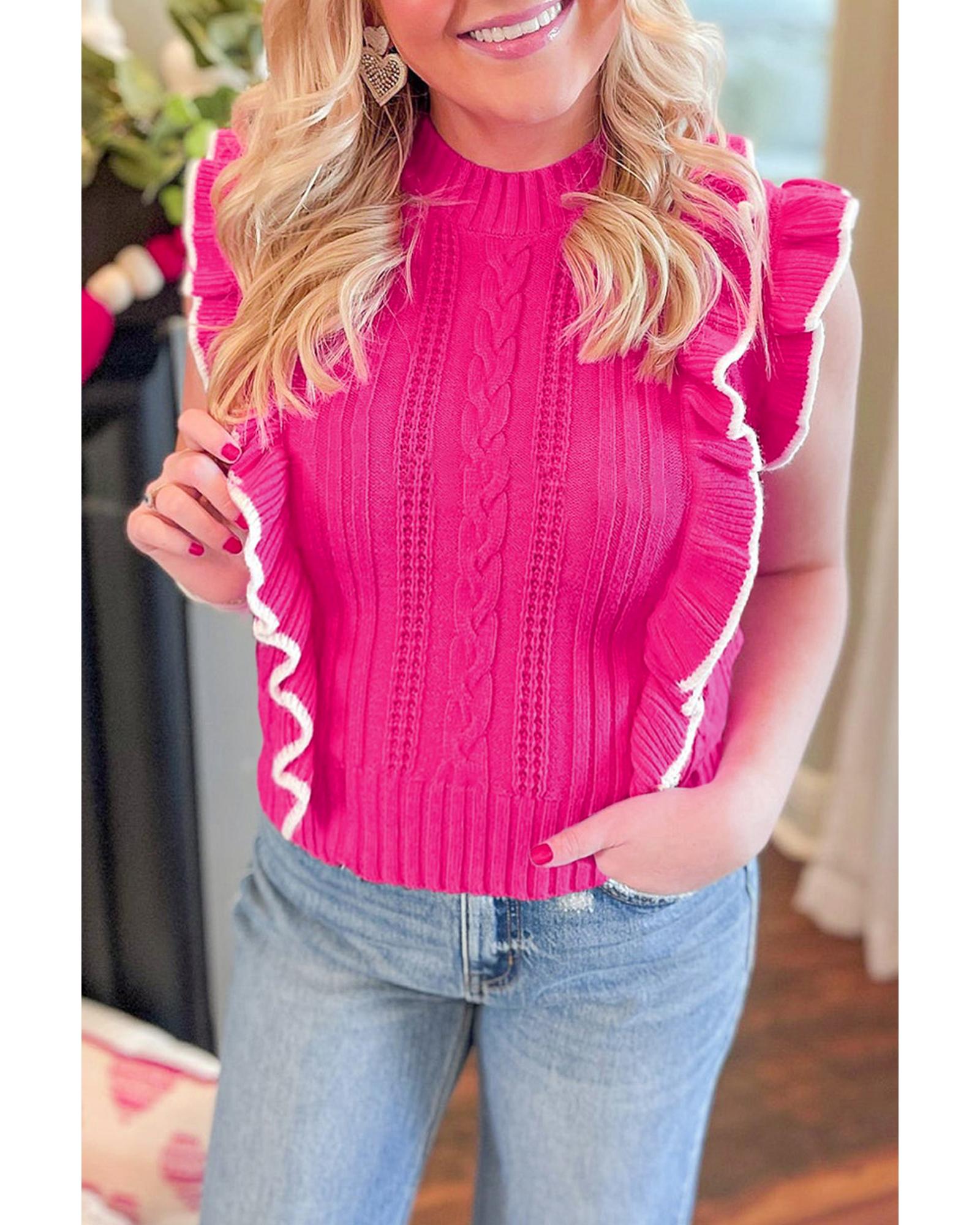 - Strawberry Pink Textured Knit Ruffled Mock Neck Sweater Tank