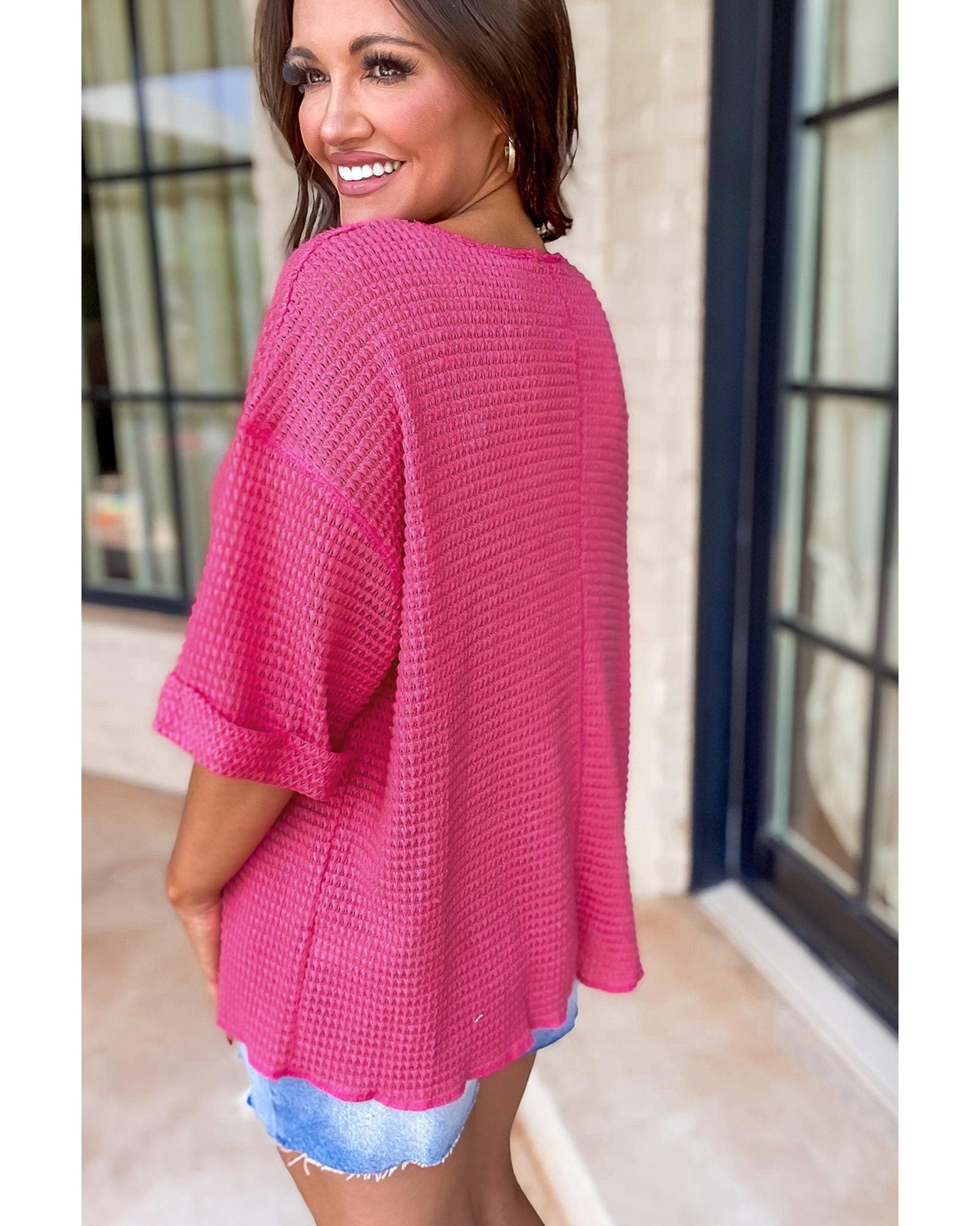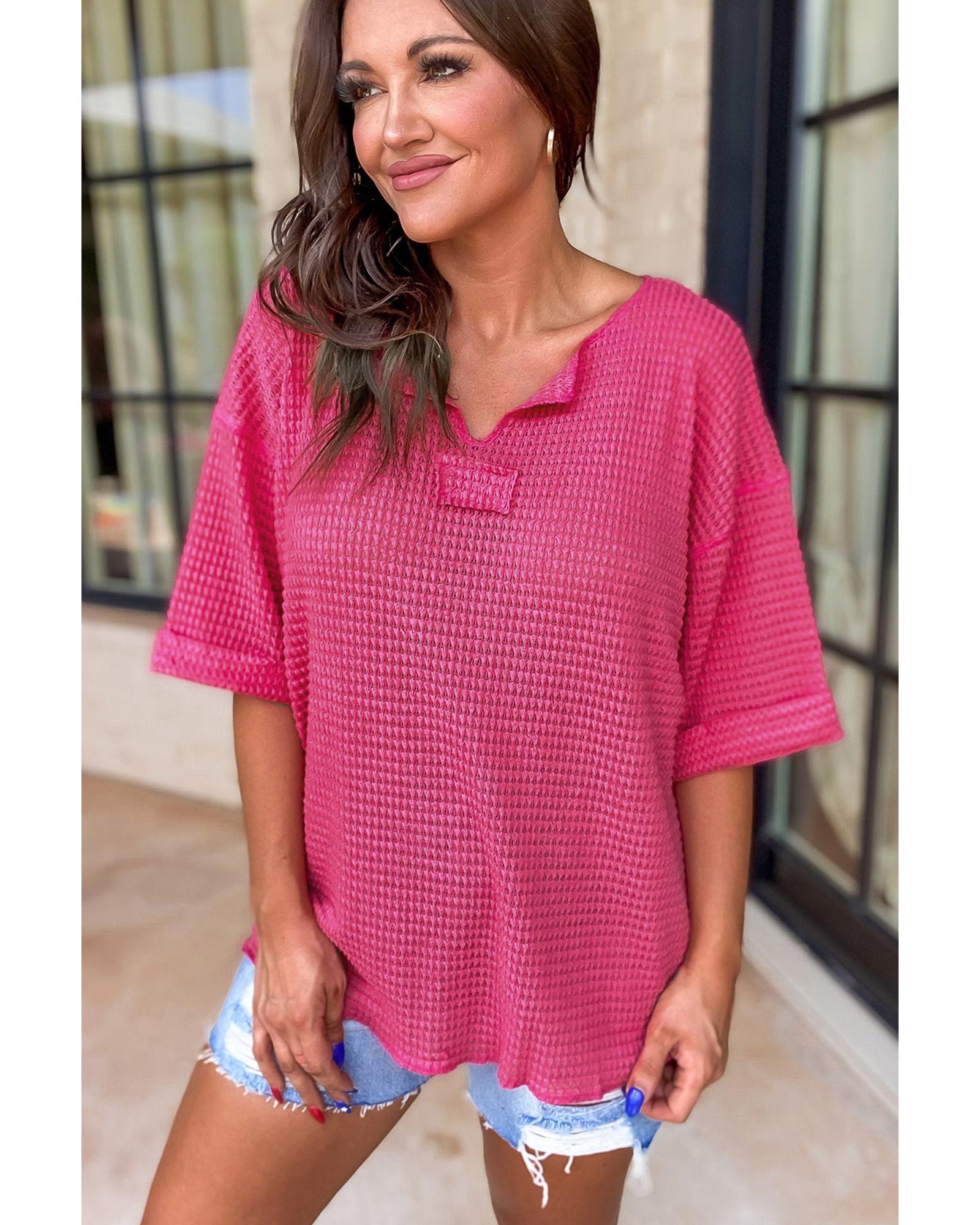 Strawberry Pink Textured Knit Split Neck Cuffed Short Sleeve Top – L