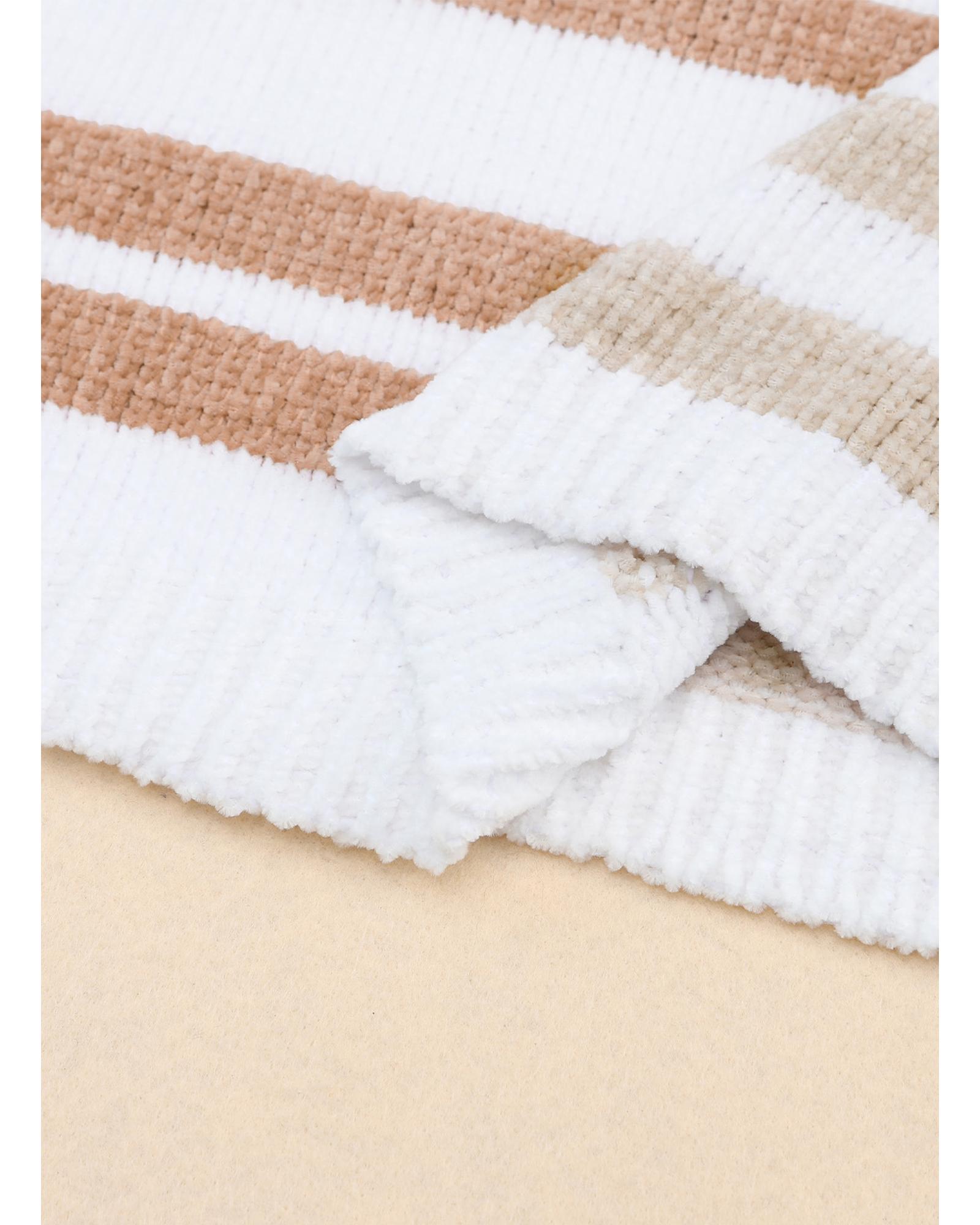 Beige Striped Pom Pom Knit Open Front Long Cardigan - M