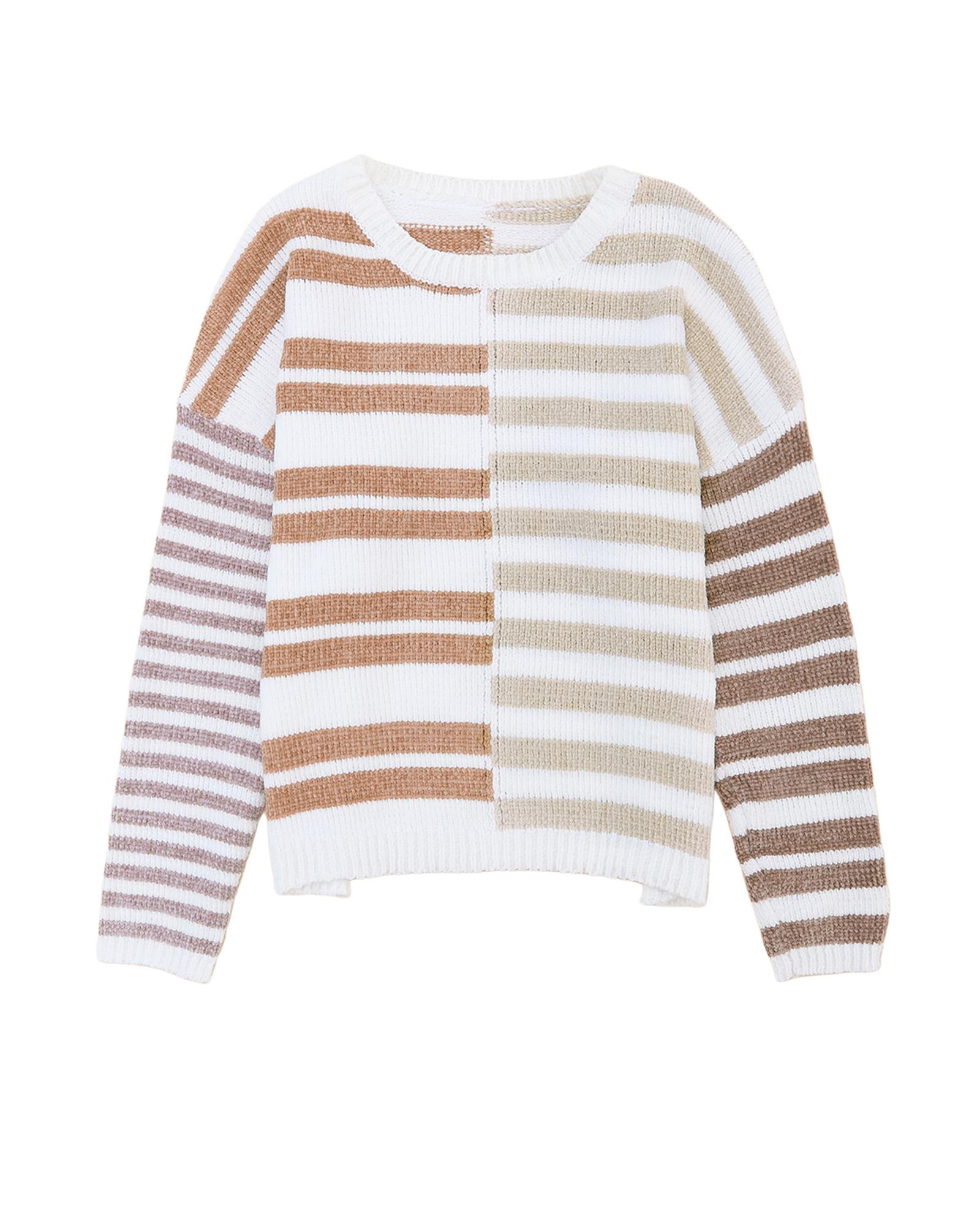 - Super fun knit sweater with multi colors in the stripe and a fun blocking pattern