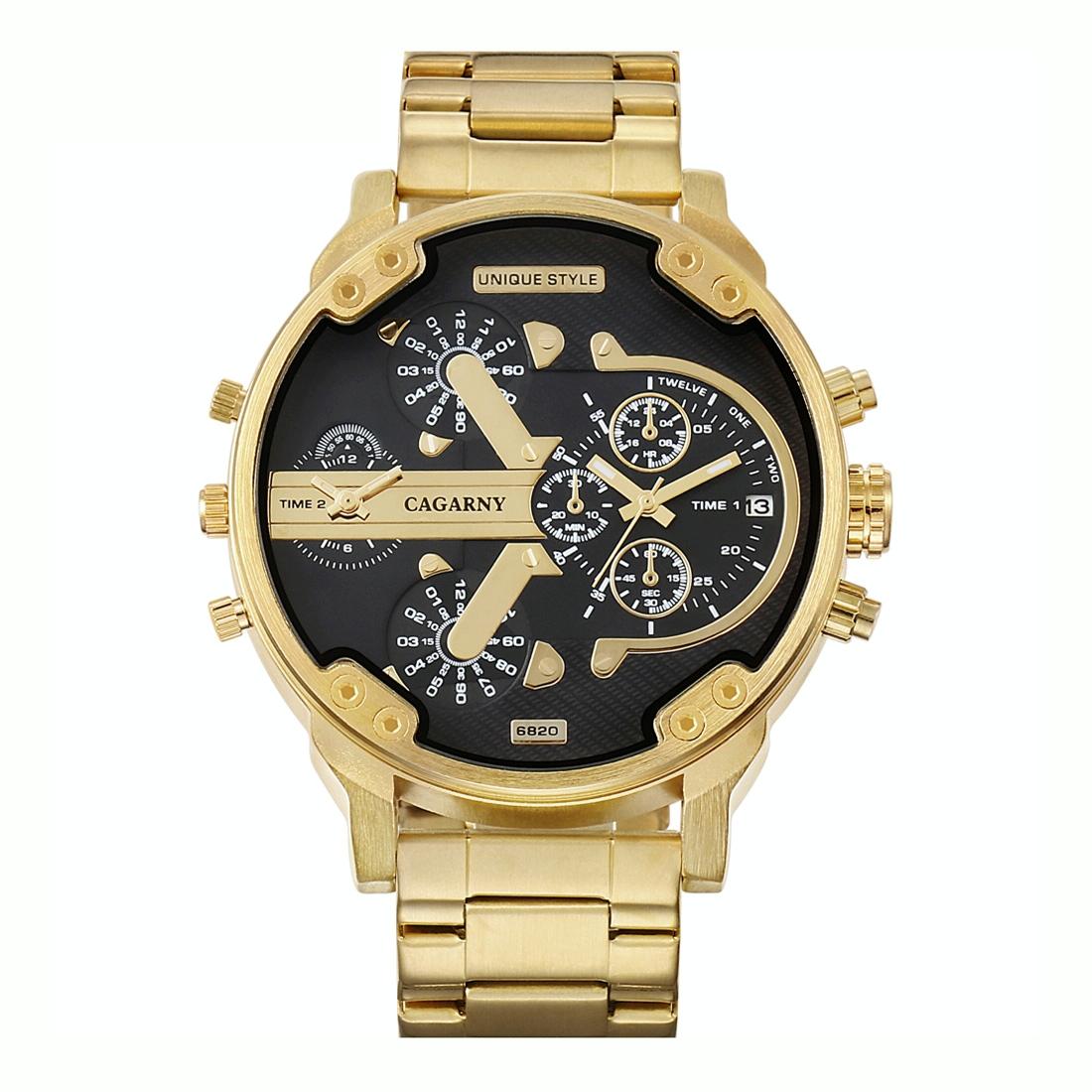 • 1 x 6820 Fashionable Business Style Large Dial Calendar Display Men Quartz Dual Movement Watch With Stainless Steel Band Gold Black