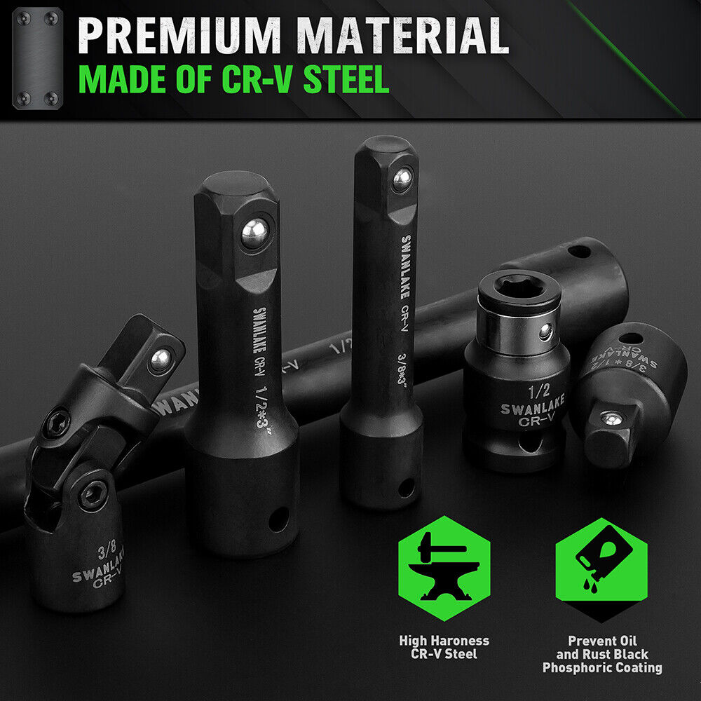 【Material】:The impact extension socket set is made of Heavy-duty Chrome-Vanadium steel alloy,durable and hard to use,a corrosion-resistant black phosphate finish.
