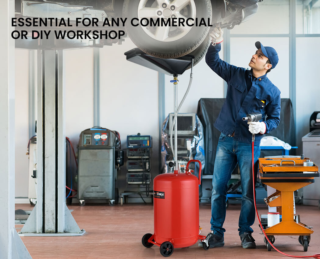 It features a large 10L detachable swiveling oil collection pan with a mesh screen to catch any foreign objects. A telescopic lifting shaft that easily adjusts in height from 98cm right up to 164cm. This allows the commercial-grade T-REX to be easily positioned under the car, as well as being suitable for use in a variety of other automotive workshop applications.