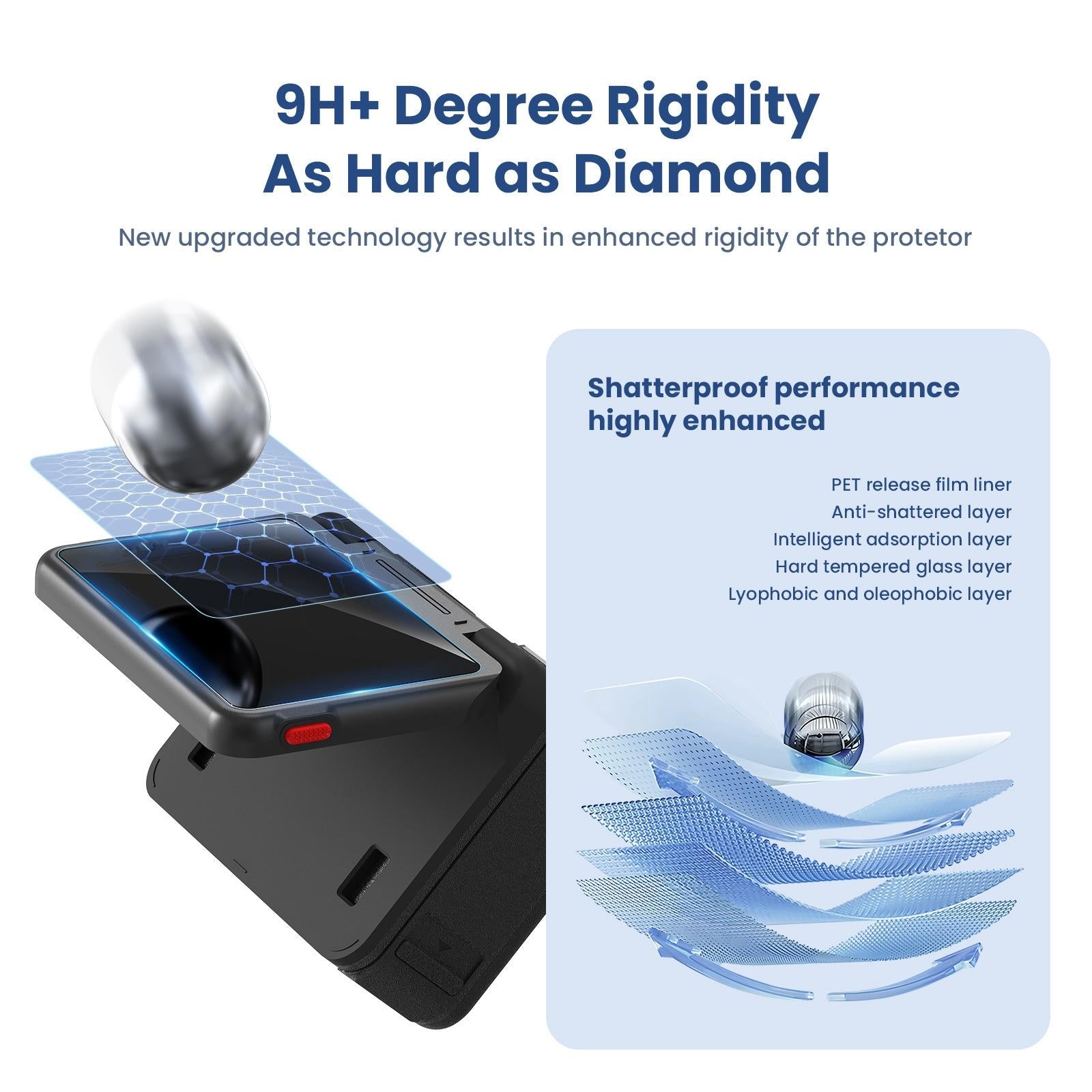 • 9H+ high hardness, reinforced glass fiber material layer, 5 layers of pressure resistance, efficient explosion-proof