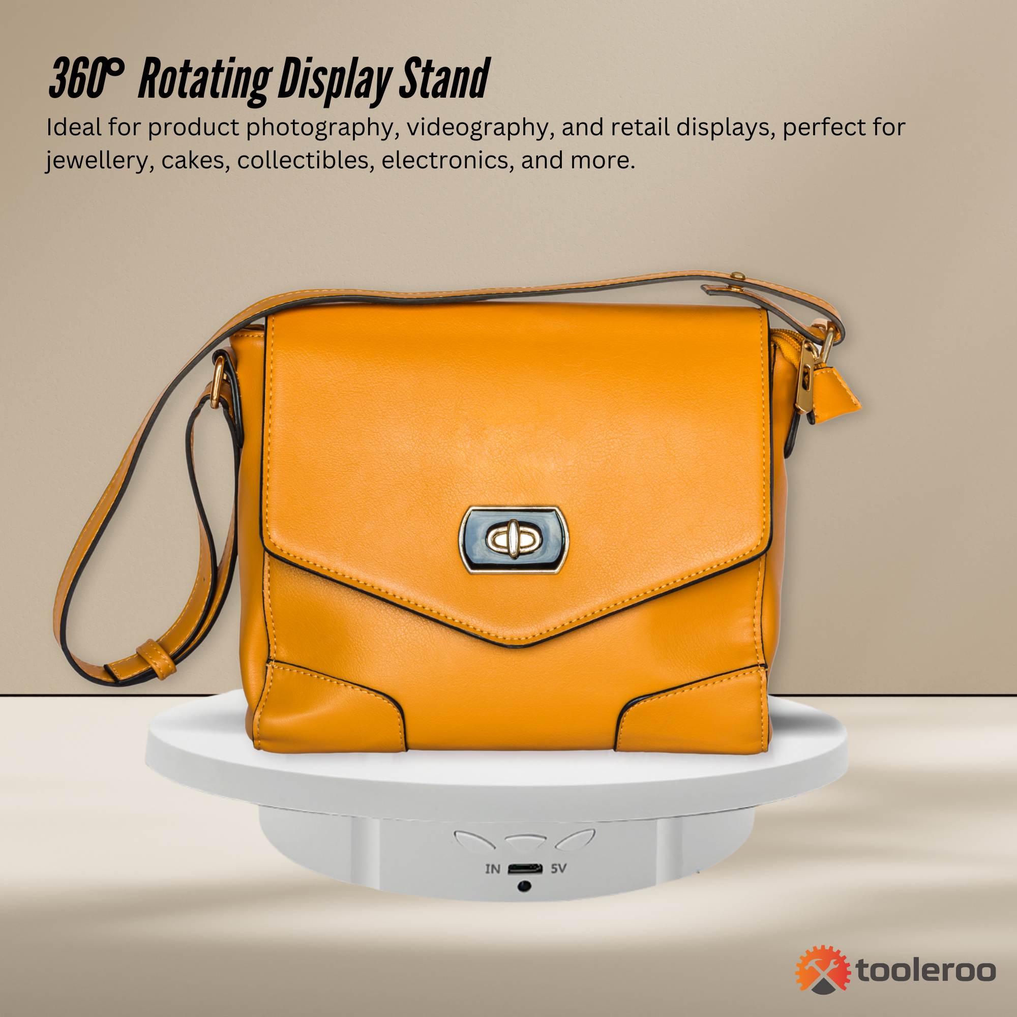 • 360° Rotating Display Stand – Ideal for product photography, videography, and retail displays, this electric turntable ensures smooth and quiet rotation, perfect for jewellery, cakes, collectibles, electronics, and more.