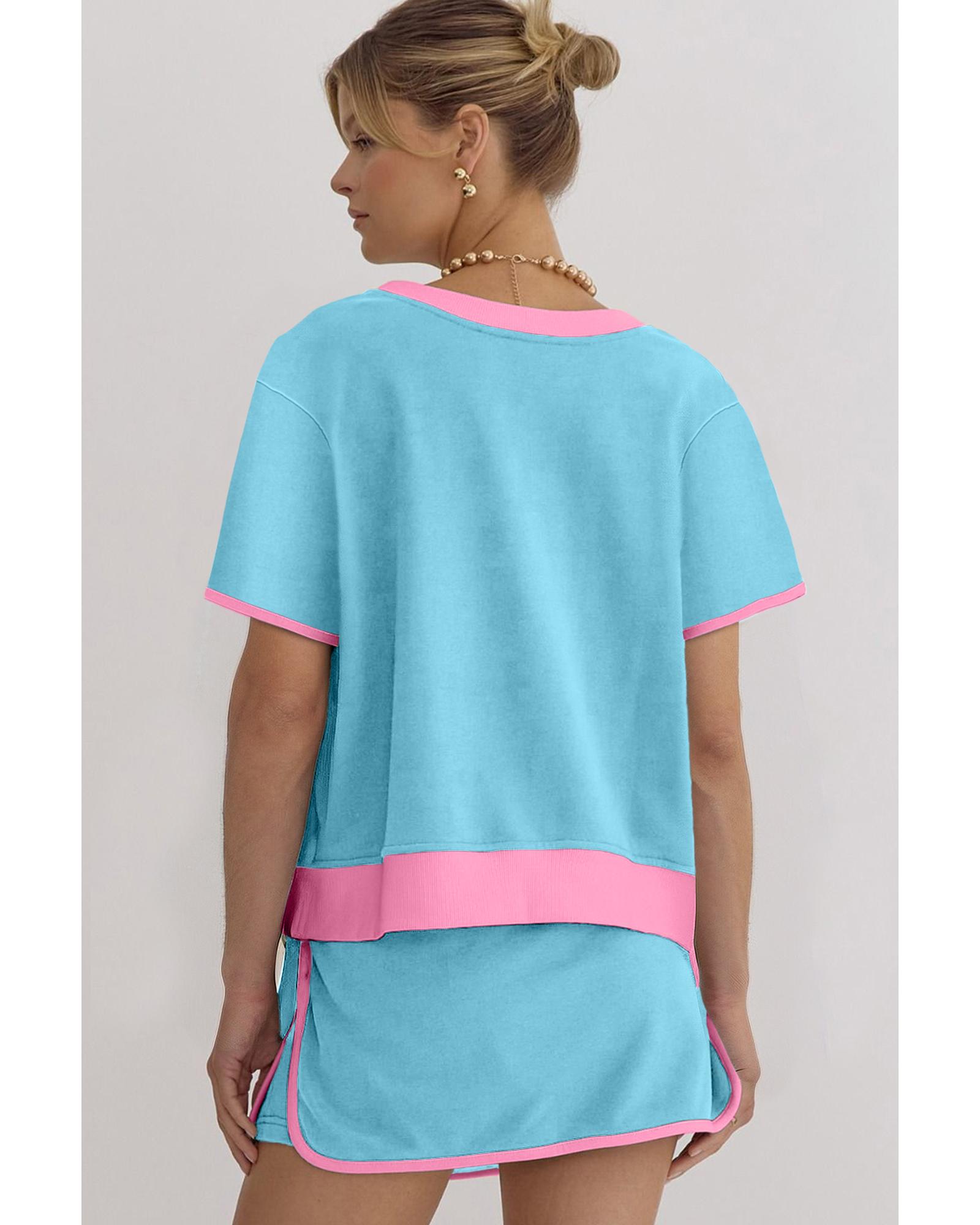 Turquoise Colorblock Edge Drop Shoulder T Shirt and Skirt 2Pcs Set – M