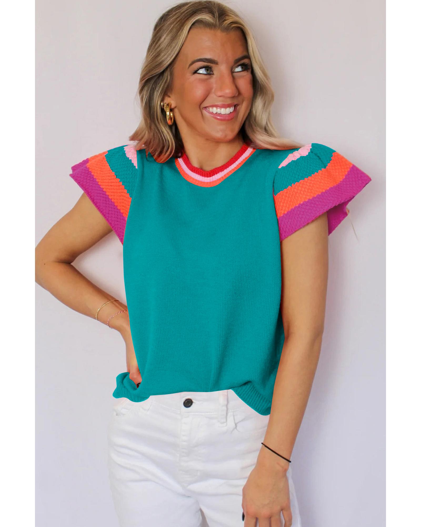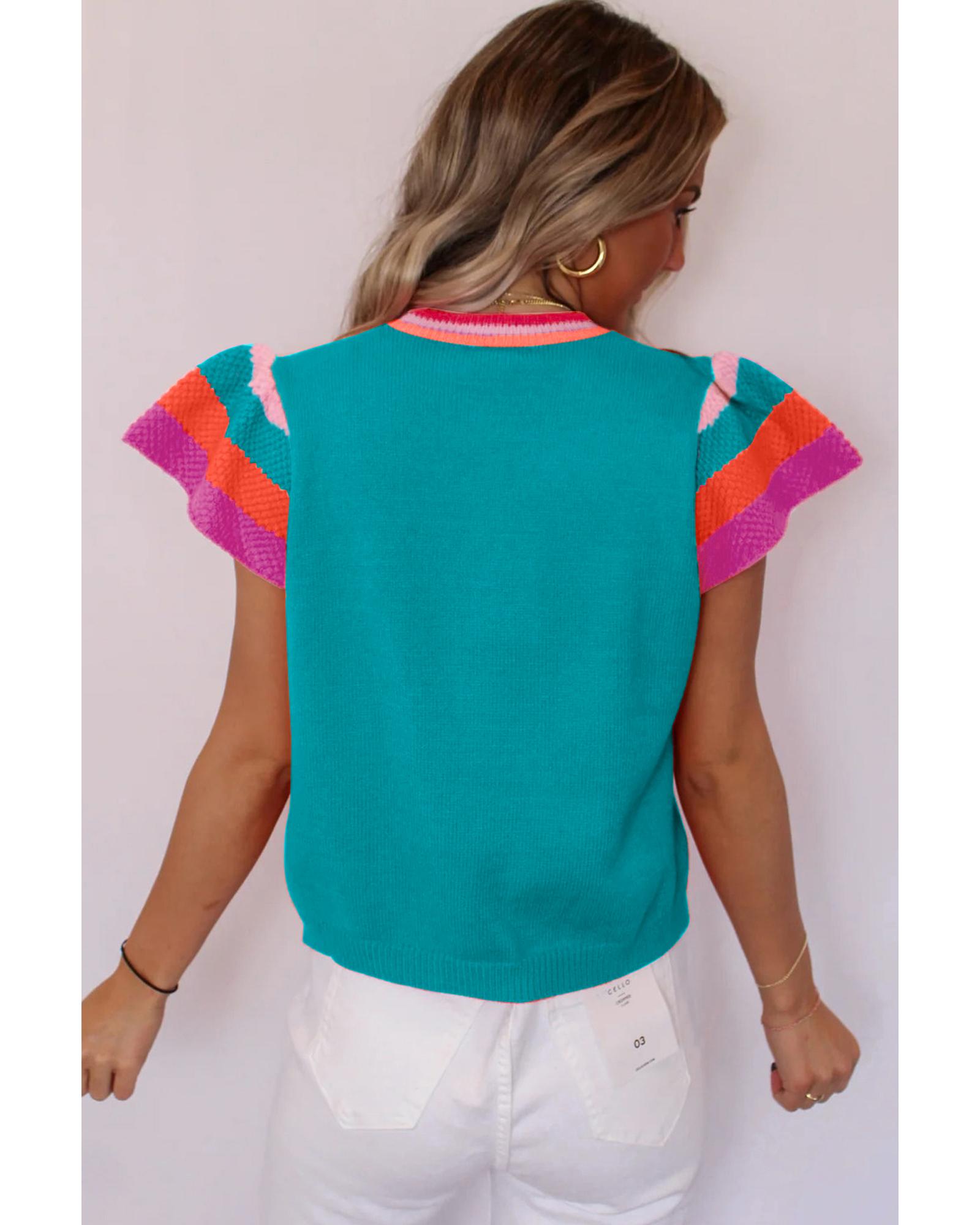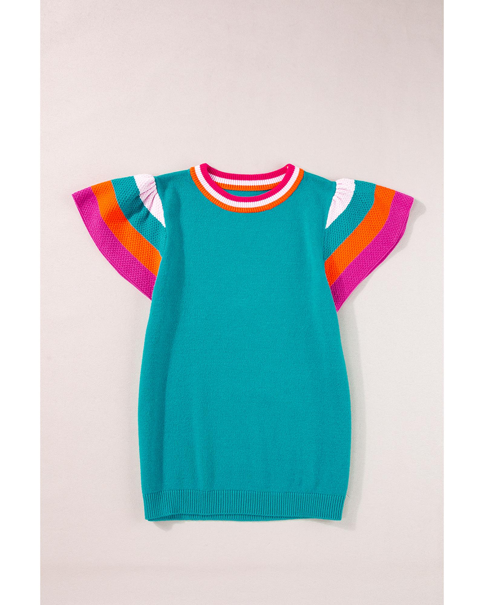 Turquoise Contrast Flutter Sleeves Knitted Sweater T Shirt – M
